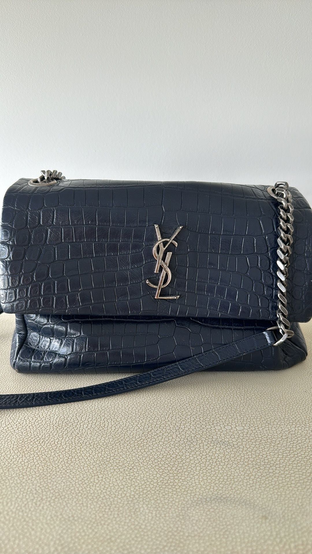 Saint Laurent crossbody or shoulder handbag in patent croc-embossed calf leather with dark silver tone hardware. Gently used- scoffs pictures- comes with dust bag. The interior is clean but there are some minor scoffs. Exterior is clean but has minor scoff on bottom corners and bottom right flap. Hardware is in perfect condition. Multiple storage areas: rear zip pocket, interior flat pocket, interior zipper pouch, and overlaying flap can also be opened. 11.5" L x 4" W x 8" H Strap is 43" long (full loop) with multiple holes and loops to make this a crossbody bag or a shoulder bag. Only Zelle or cash accepted
