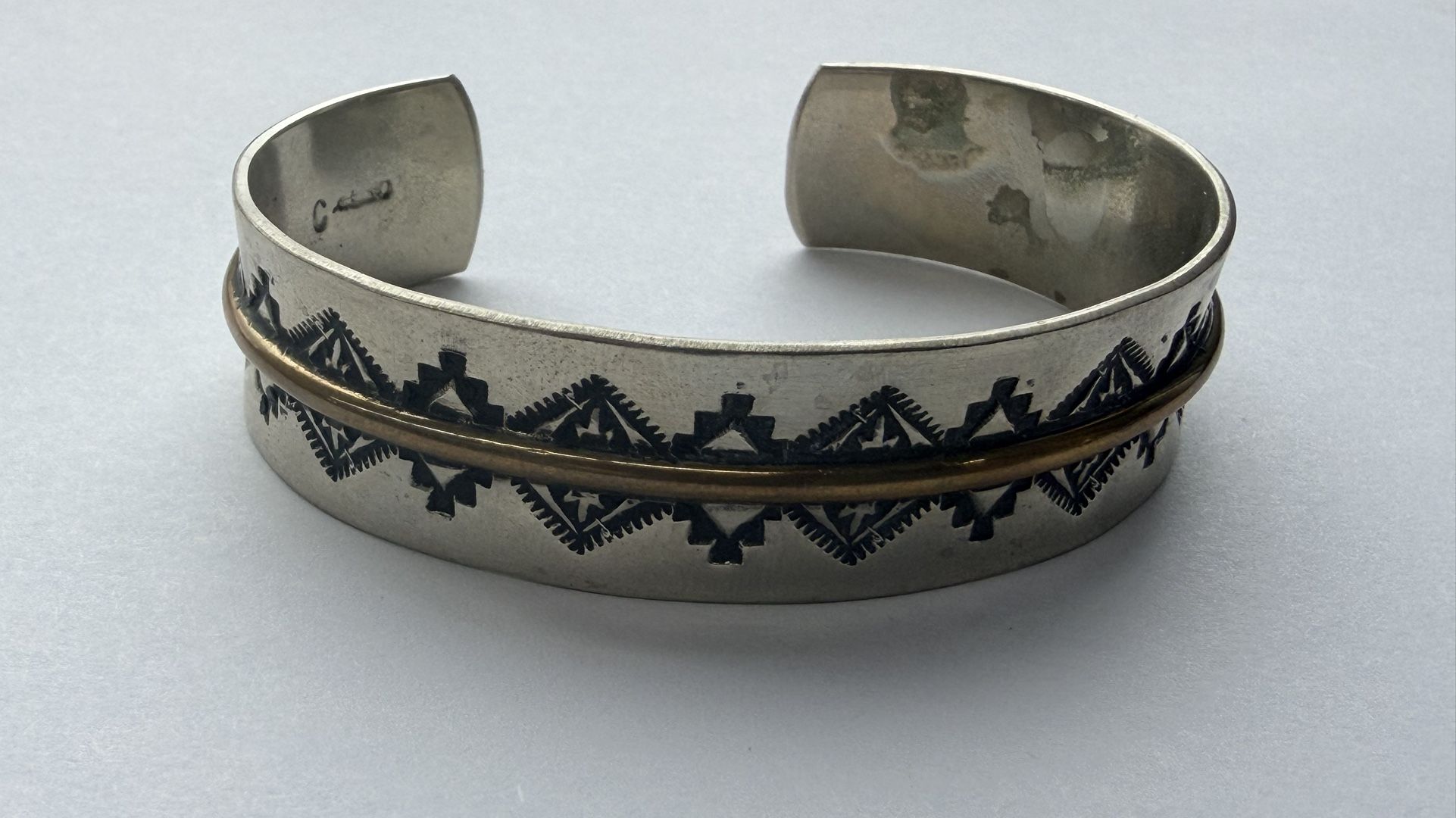 Calo(?) signed storyteller cuff with brass banding 6 3/4 in size 1 in gap 30.1 g