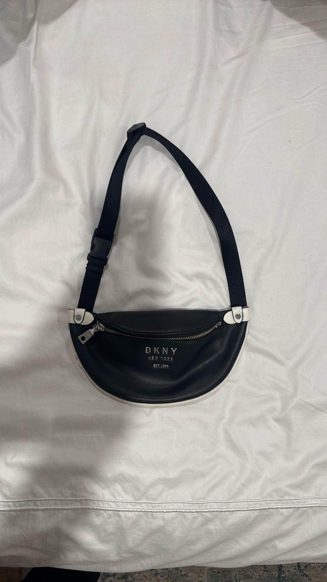 DKNY Crossbody bag can be worn at waist. Strap is adjustable. Black with white trim, zipper closure with two inside pockets. Perfect condition never used