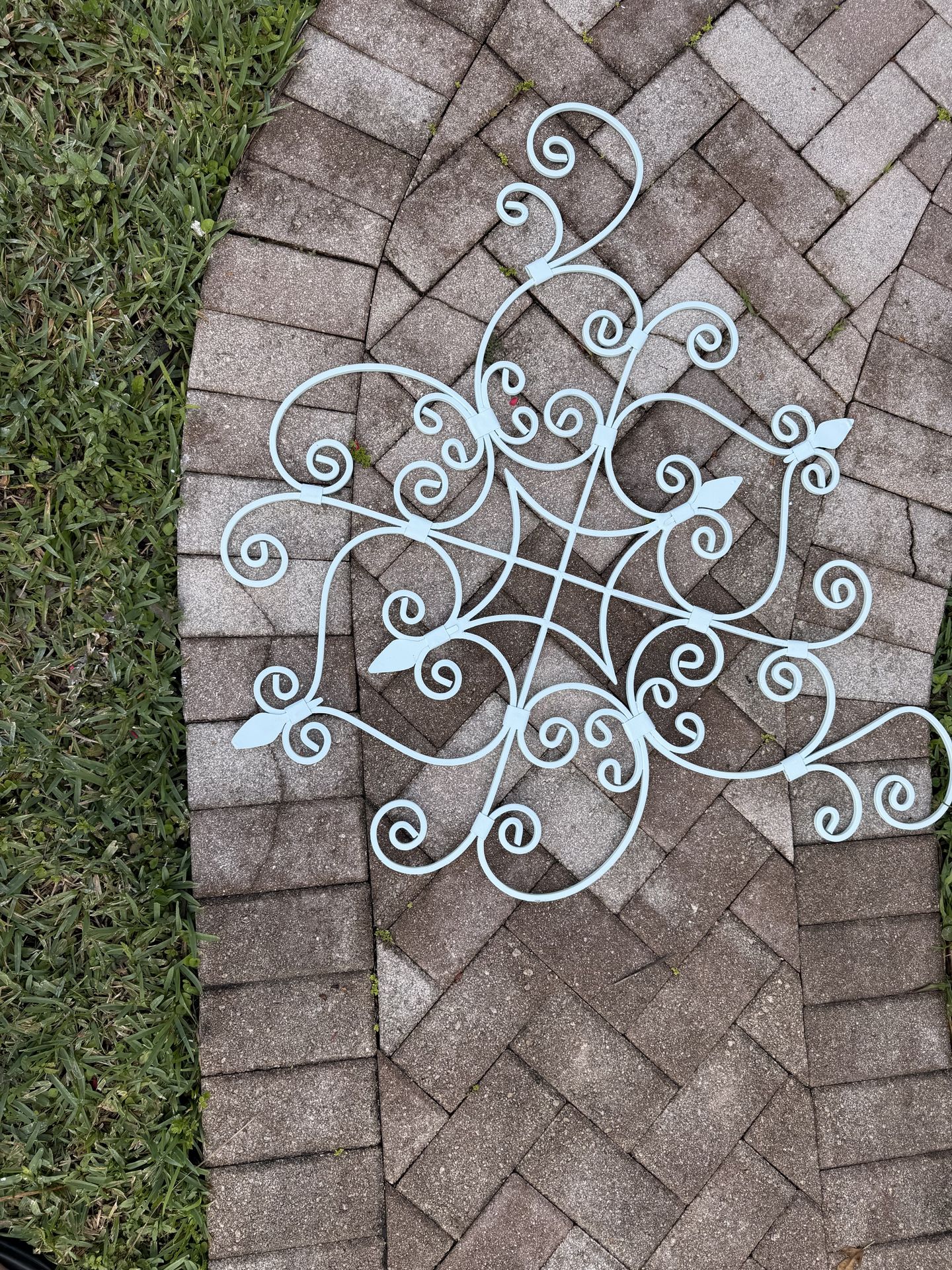Super heavy wrought iron metal wall decor was painted, please see pictures to see where it rubbed off. This is a pretty piece for hanging up inside or outside. Measures 39 1/2 x 35 1/2. Keep it as is, or paint it a fun color to match your decor. Has some minor issues with paint and a couple little bends on the points, please see pictures.