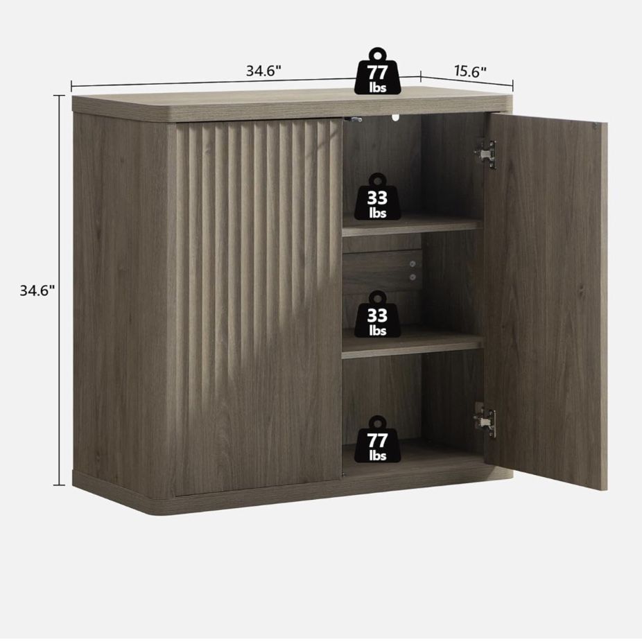 Set of 2 sideboard/ buffet wood cabinets Heavy and sturdy! Color: Grey Alder Open/close mechanism: push (no handles) Dimensions (in): 34.6 H x 34.6 W (69.2 for both) x 15.5 D Original price: $480 for both Asking: $200 for both, negotiable Only got these about 6mo ago, no issues with them just swapping for something else