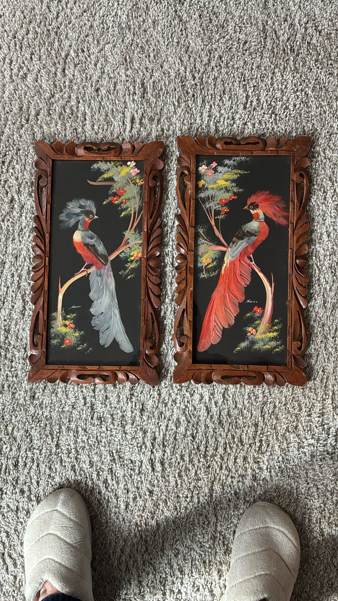 Two pictures made in Mexico with the story of the Mexican feather craft