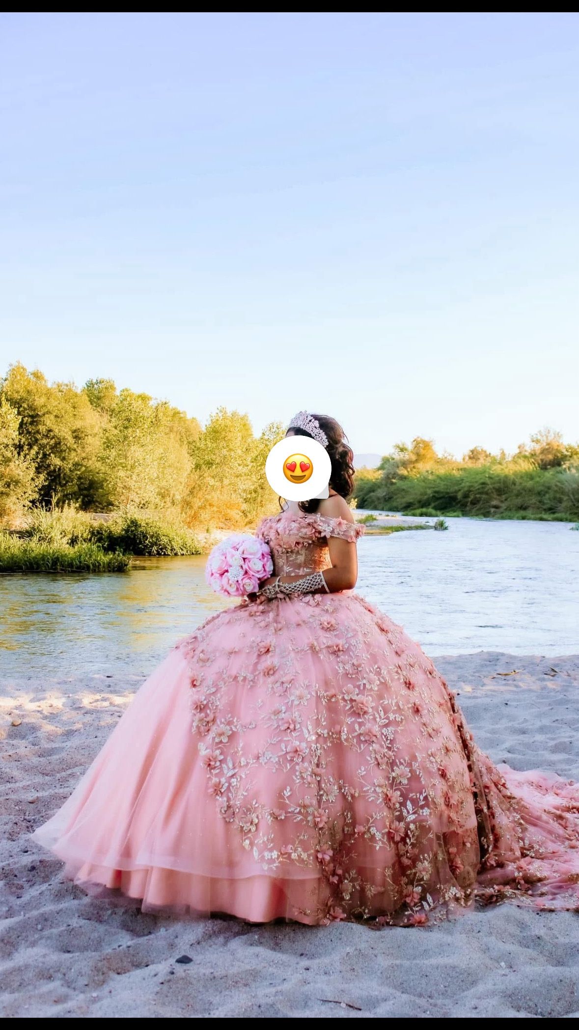 use normal wear. The dress is still in. Very good condition. It is like avery light blush pink. Most of the trust is customize like the longer tail, and all the diamonds and golden flowers. It has on it was customized onto it. and it has a corset. The big pillow little pillow picture book and signature book come Included. As well as the copas.(whine glasses) and the cake knives the cake, knives were never used, nor were de copas and also comes with the first crown, and the second crown included some gems are missing from the first of second crown, but it’s only one or two gems that couldn’t be easily replaced. It’s not in very usable spots, but some are missing. If you would like to come see these things in person you can let me know ahead of time, and we can set something up for you to come and look at everything whenever you’d like. Also, the signature papers on the signature book. I did take them out because they were all signed, so you would just have to get your own pictures for the signature book. and the only thing I don’t have is the ramo (flower bouquet) pick up only. also willing to meet.