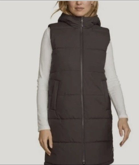 Eddie Bauer Womens Puffer Vest purple Long Hood Pockets Sleeveless.....size SMALL,,MEDIUM