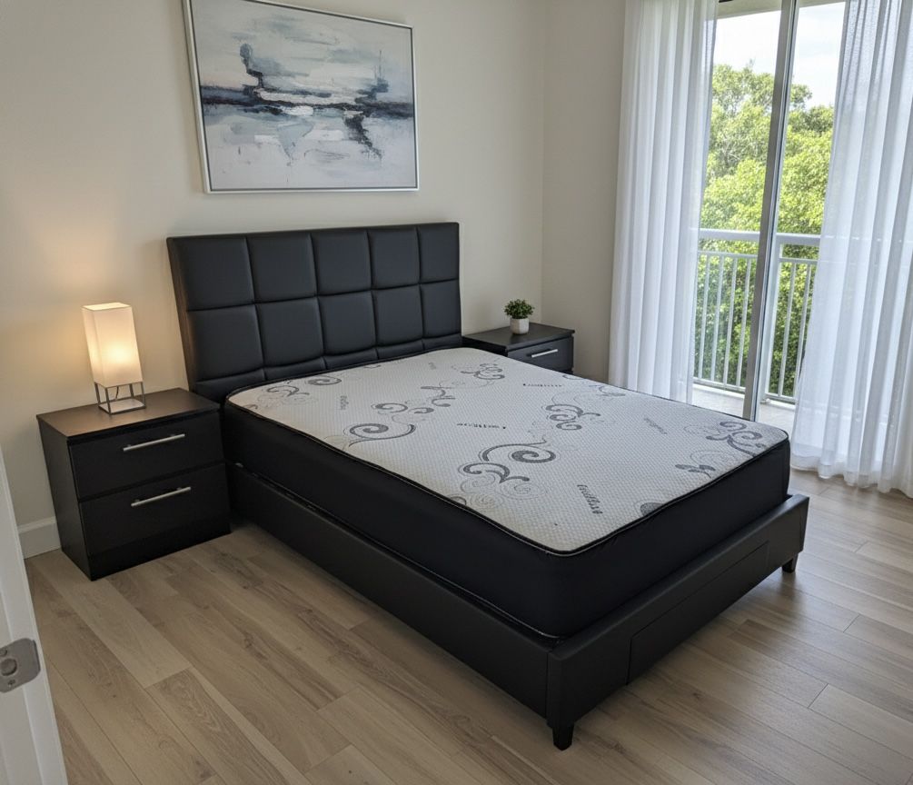 Brand New Queen Bed Frame with Mattress and 2 Nightstands / Cama Queen con Colchón y 2 Mesas de Noche Nuevo a Estrenar … Fast 🚚
