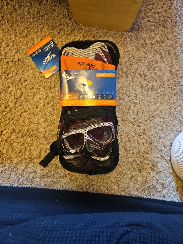 Hello, Looking to sell this Speedo Mask, Snorkel, amd Fin set. I bought it for my daughter for a present, but she never ended up using it, so I've just had it sitting around. Shoot me an offer, I'm available to meet in the West Sacramento area.