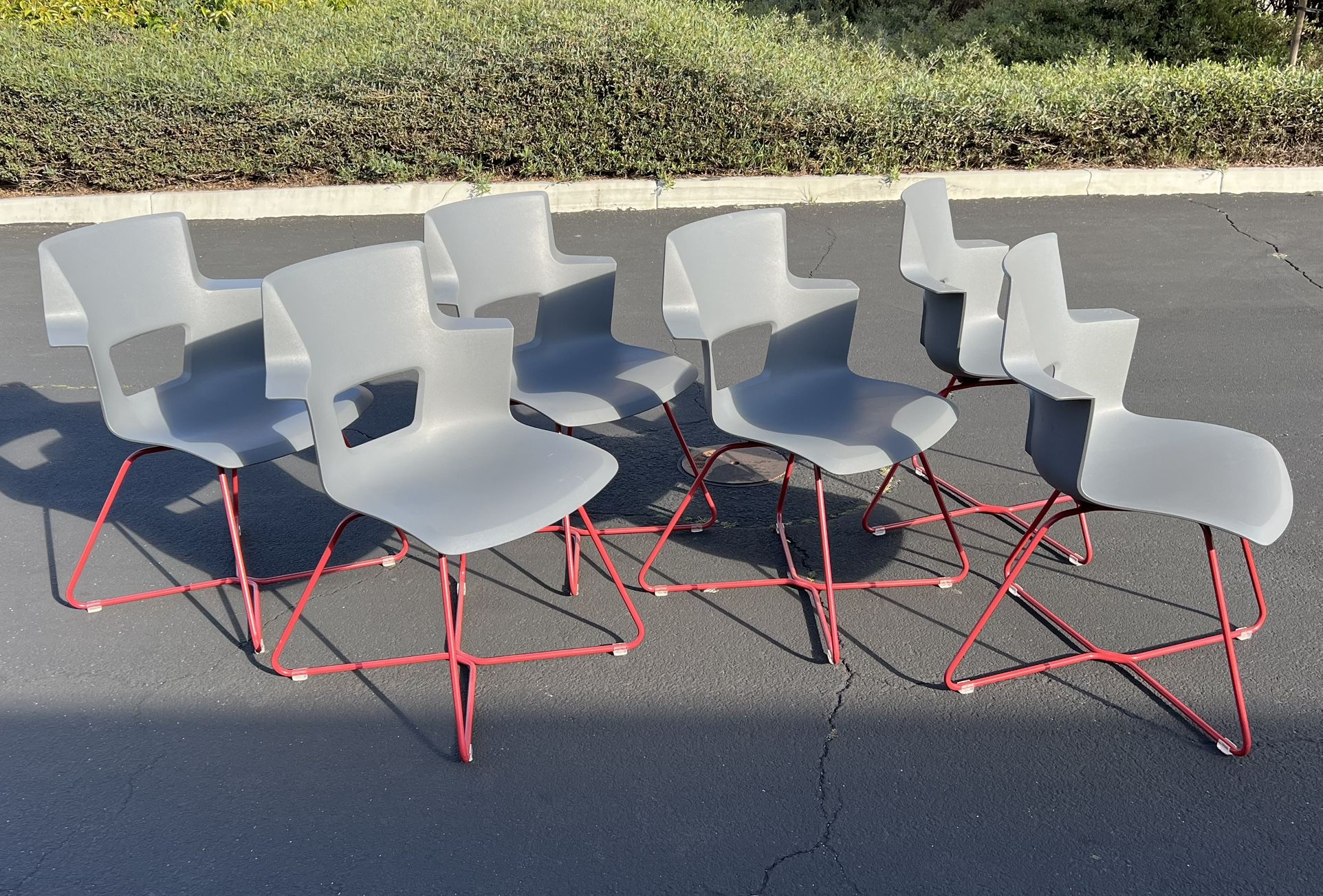 Set of 6 Steelcase Turnstone Shortcut X- base chairs, with gray seats and heavy duty metal red X base. In good condition, can be used for dining room table or office guest chairs . Base legs are steel metal and have some weight to them . Each chair retails over $350 . Measurements: 33 in H x 25 in W x 21.5 in D ………………Delivery Available………… Feel free to check out my other items for sale! Majority of the furniture I get are from Warner Bros Movie props and usually used for staging. Also follow my page since I always post new items. Thanks