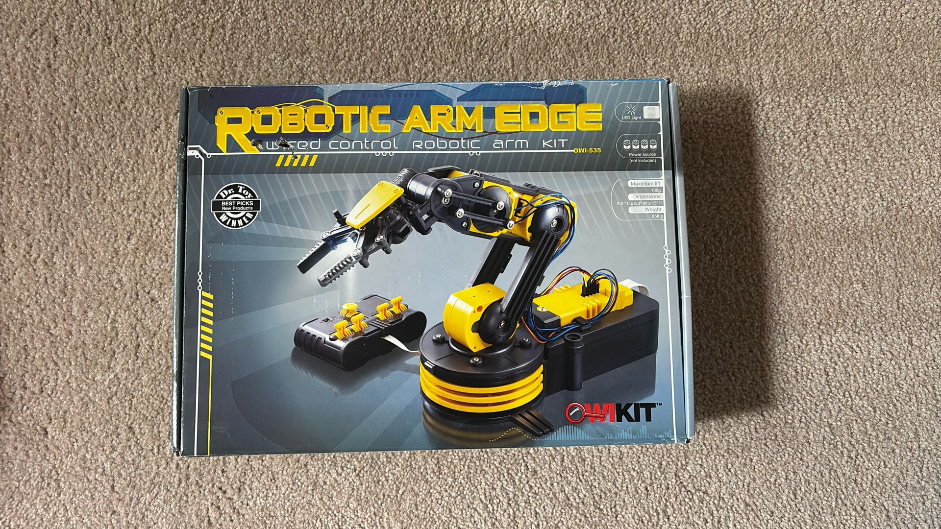 With Robotic Arm Edge, you command the gripper to open and close, wrist motion of 120 degrees, an, extensive elbow range of 300 degrees, base rotation of 270 degrees, base motion of 180 degrees, vertical reach of 15 inches, horizontal reach of 12.6 inches, and lifting capacity of 100g. WOW! Some added features include a search light design on the gripper and a safety gear audible indicator is luded on all five gear boxes to prevent any potential injury or gear breakage during operation.
