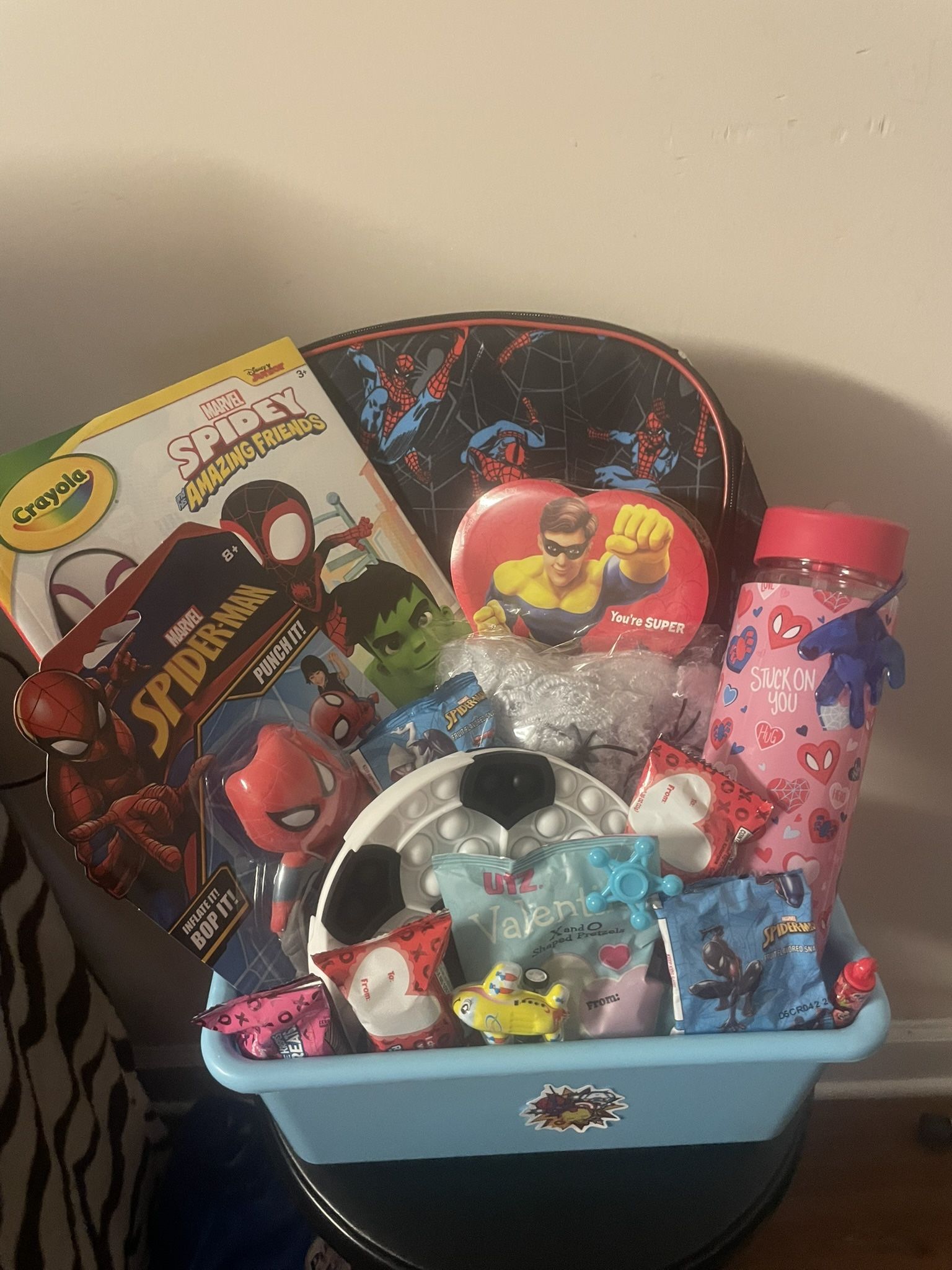 Spider-Man back pack Spider-Man inflate and bop it toy Spidey and friends coloring book You’re my hero Valentine’s Day box candy Stuck on you Spider-Man Valentine’s Day water bottle Soccer shaped poppit Velentines day rice krispy treats Valentine’s Day mini bag pretzels Spider decorative web Mini bubbles Pull back air plane toy Spider-Man fruit snacks Mini fidget spinner Hand shaped slimy wall sticker toy