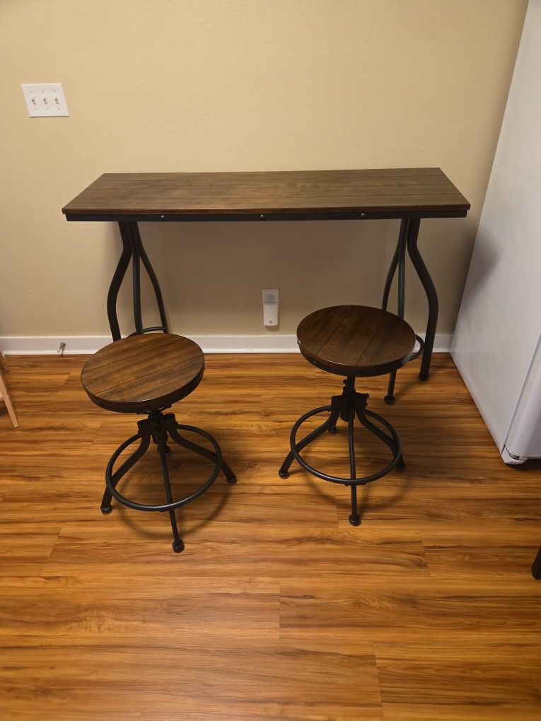 Counter table + 2 adjustable stools. Rustic style, in good condition. Dimensions: 54Lx18Wx35T