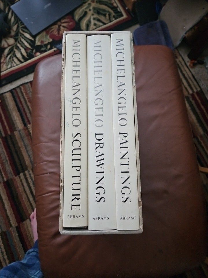 3 complete volumes of all the works of Michelangelo. This set is the only set that is used professionally to catalog his work and is used when referencing his work. A must-have for any library, public or private. Comes in a hard case that holds all 3 volumes.