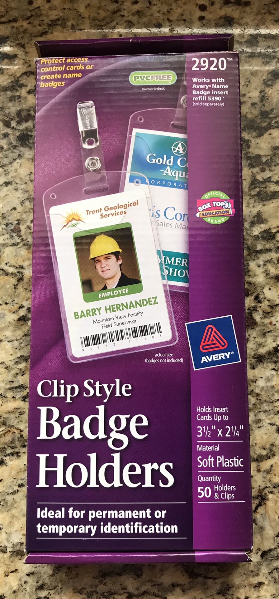 New in unopened box Description Secure design keeps badges from falling out. Flexible badge holders are made from heavyweight plastic. Ideal for everyday use as permanent or temporary identification. Improved durability and clarity. Holders are pre-punched to accommodate lanyards and reel clips. Clip styles include patented Avery Garment Friendly clip. Hanging style includes 36amp;quot; non-elastic neck cord. Secure Top. Insert Width: 2 1/4 Insert Height: 3 1/2amp;quot; Orientation: Vertical Colors: Clear. Features & details Insert_Width - 2 1/4" Insert_Height - 3 1/2" Orientation - Vertical Colors - Clear