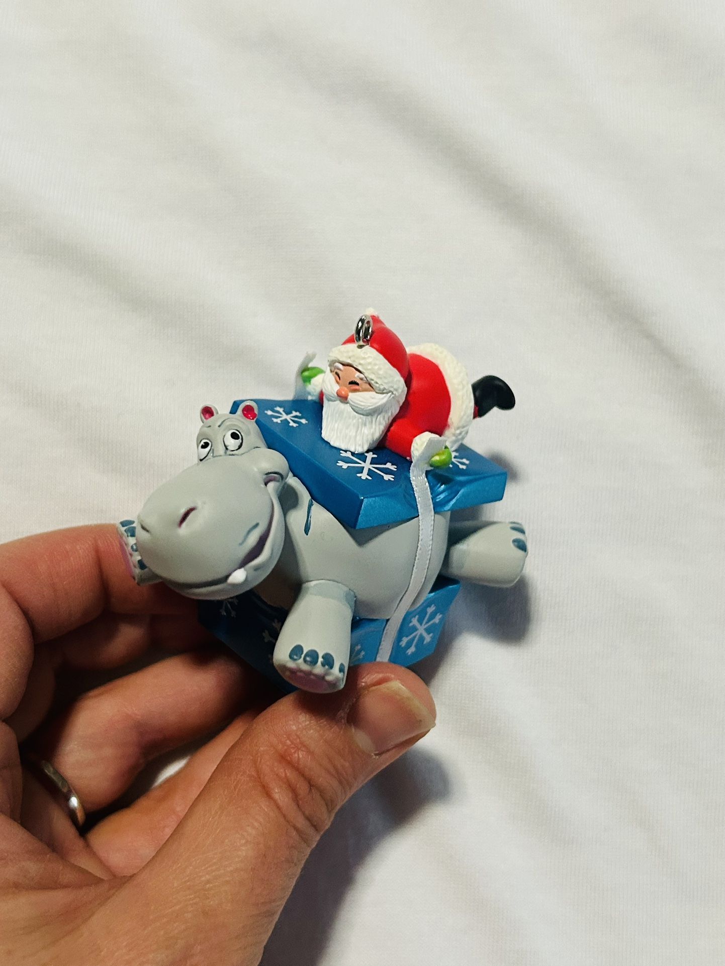Delight your child with this charming Santa and Hippo toy ornament that plays the song, “I Want A Hippopotamus For Christmas” with a push of a button. Like new ornament and comes in its original box. Measure 2.5 x 3.5 inches. Batteries are included. Perfect for any hippo fan.