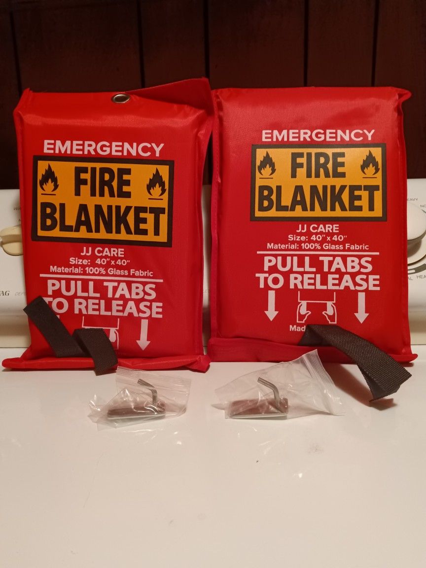 Two fire suppression blankets... Great for home or job site fire emergency... Wall stick on mounting hook with each blanket... New never used... Can be repacked and reused after initial use to suppress a fire... Great for peace of mind with children in fire emergency... Local pickup only...