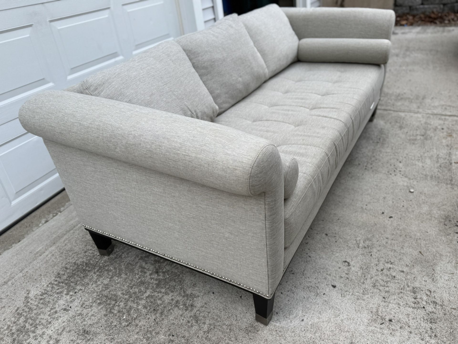 Two identical Jonathan Louis sofa in light gray upholstery. Features rolled arms, tufted bench seat, three back cushions, nailhead trim, and two bolster pillows. Comfortable, modern look. No rips or structural issues – just normal wear. From a smoke-free home. Dimensions (approx): 84” W x 35” D x 32” H Pickup only.