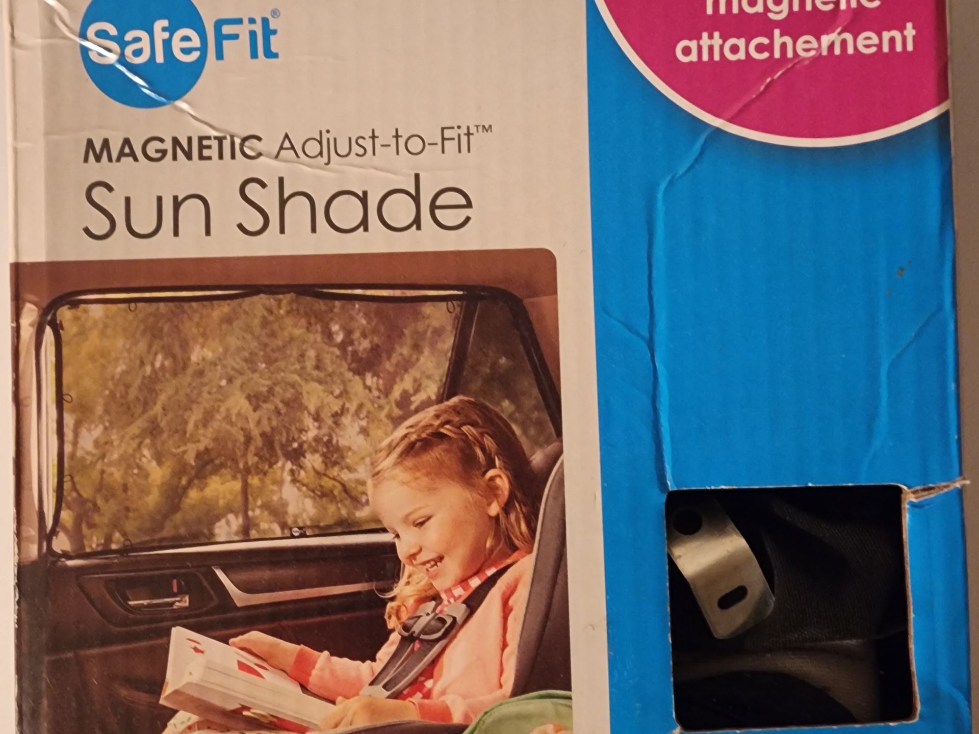 Brand new SafeFit magnetic adjust-to-fit sun shade. Easy magnetic attachment, universal fit. Perfect for keeping kids protected from the sun in the car.