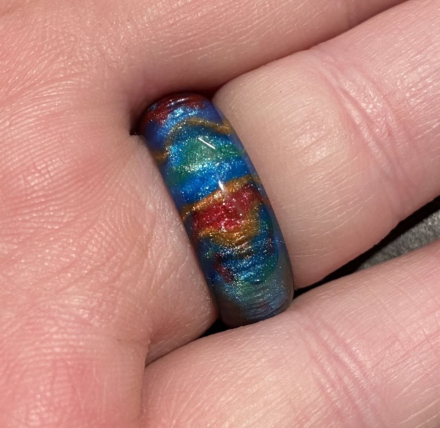 Trendy Multicolor Sparkle Acrylic Ring is the hottest new style in engagement and wedding jewelry (I prefer it as a thumb ring) light weight, comfortable and durable, these are perfect! Sz 7