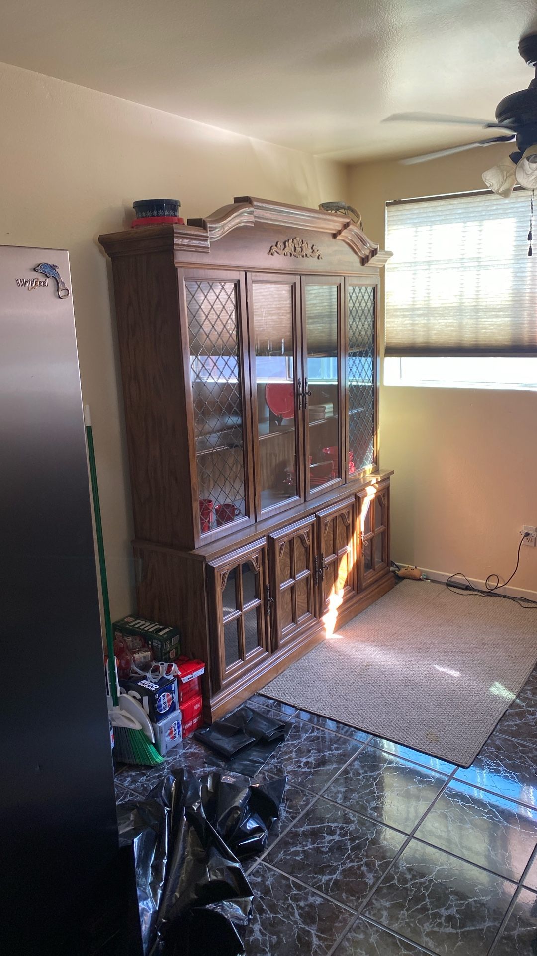 Old fashioned hutch for fine china. About 5ft wide and 6.5ft tall. It does have lighting features but needs a bulb.