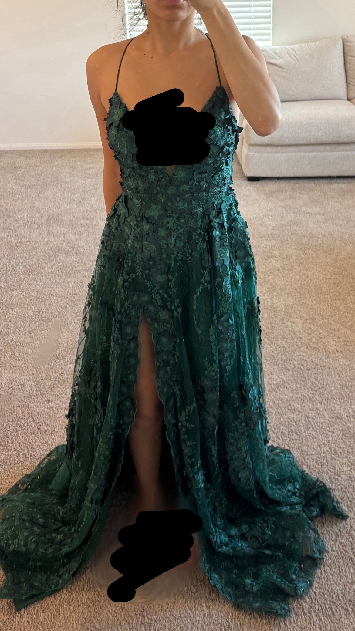 Forest green formal dress w/ Floral Appliqué, Tulle/Mesh Underlayer, and Satin Lining. Worn once and in excellent condition with working zippers, clasp, and lace up back. Fits XS-S, 5'4 height for reference. Lace up makes size adjustable