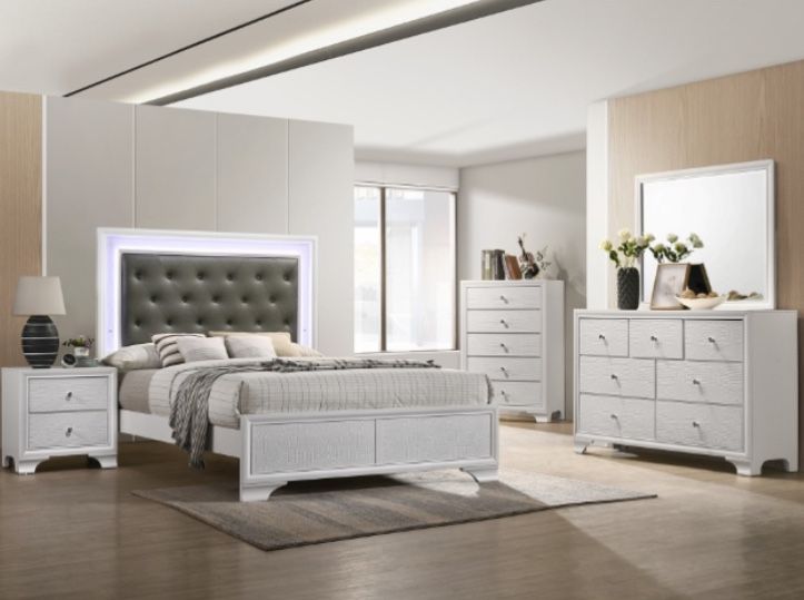 A beautiful simple bedroom set with light and dark hints and features, includes bed frame, chest, mirror, dresser and night stand! For full price, please send message! We offer many options and similar items & colors. We also offer finance with three different companies (very little to no credit needed) We offer delivery and assembly services for little to no charge! We offer competitive monthly deals and sales. For any questions or inquiries, please contact us via messages!