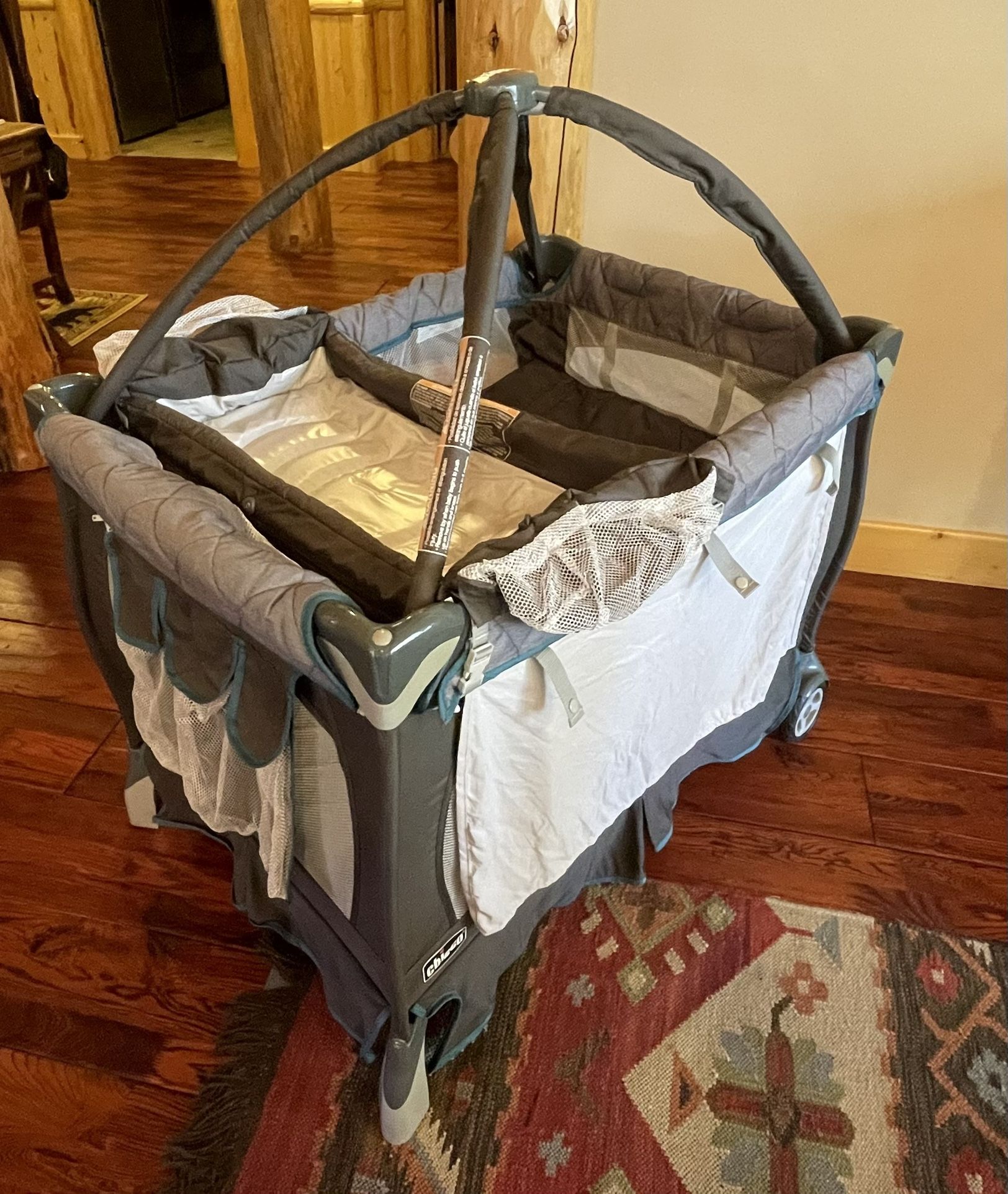 Chicco portable playard with bassinet, changing station, removable playmat with toys. Extra storage on the side plus storage/rolling bag included. Lightly used and in good condition. Cash Only. Local pickup in Big Bear City.