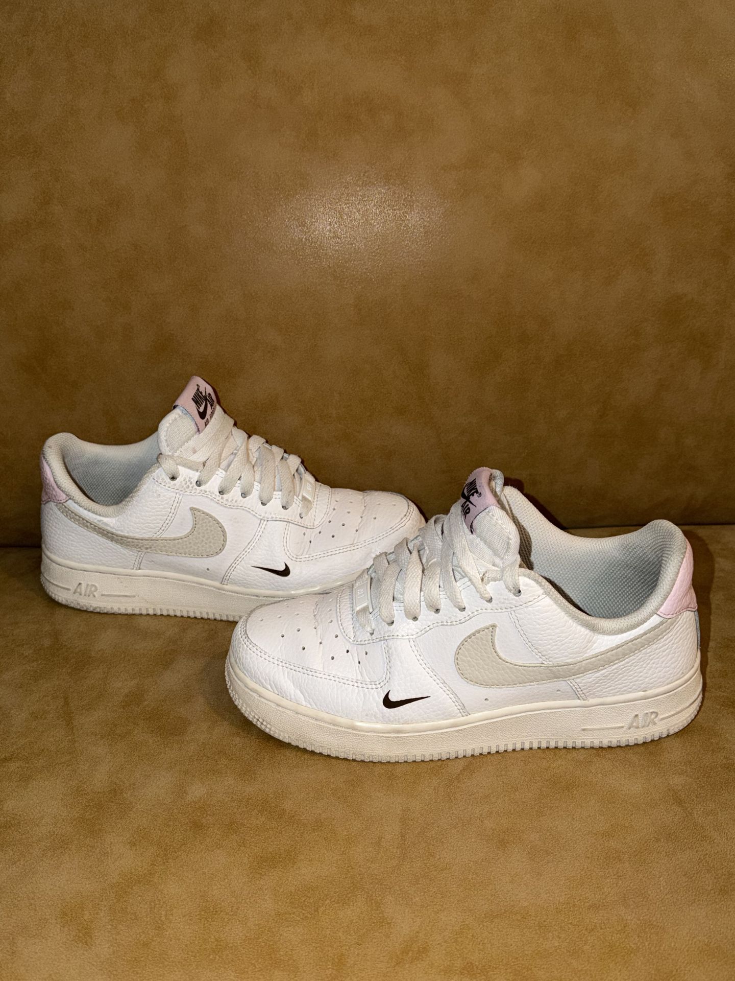 Women’s Nike Air Force 1 '07 'White Light Orewood Pink sneakers featuring a white mesh upper. Pink accents on the tongue and heel area. Subtle tan swoosh detail for contrast. Clean, casual silhouette ideal for everyday wear. Size 7 great condition
