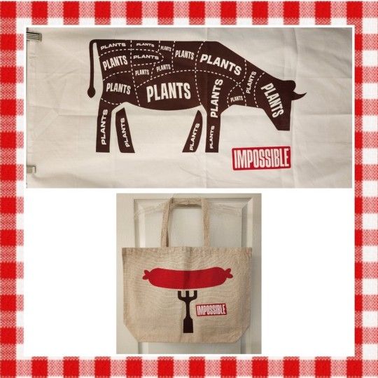 NWOT Excellent condition Impossible Foods (meat made from plants) Dish Towel 100% cotton 29-3/4" L 17" H Tote Bag 100% cotton 19-3/4" L 14-1/2" H 5" W 10" handle drop Cash only, please and thank you.