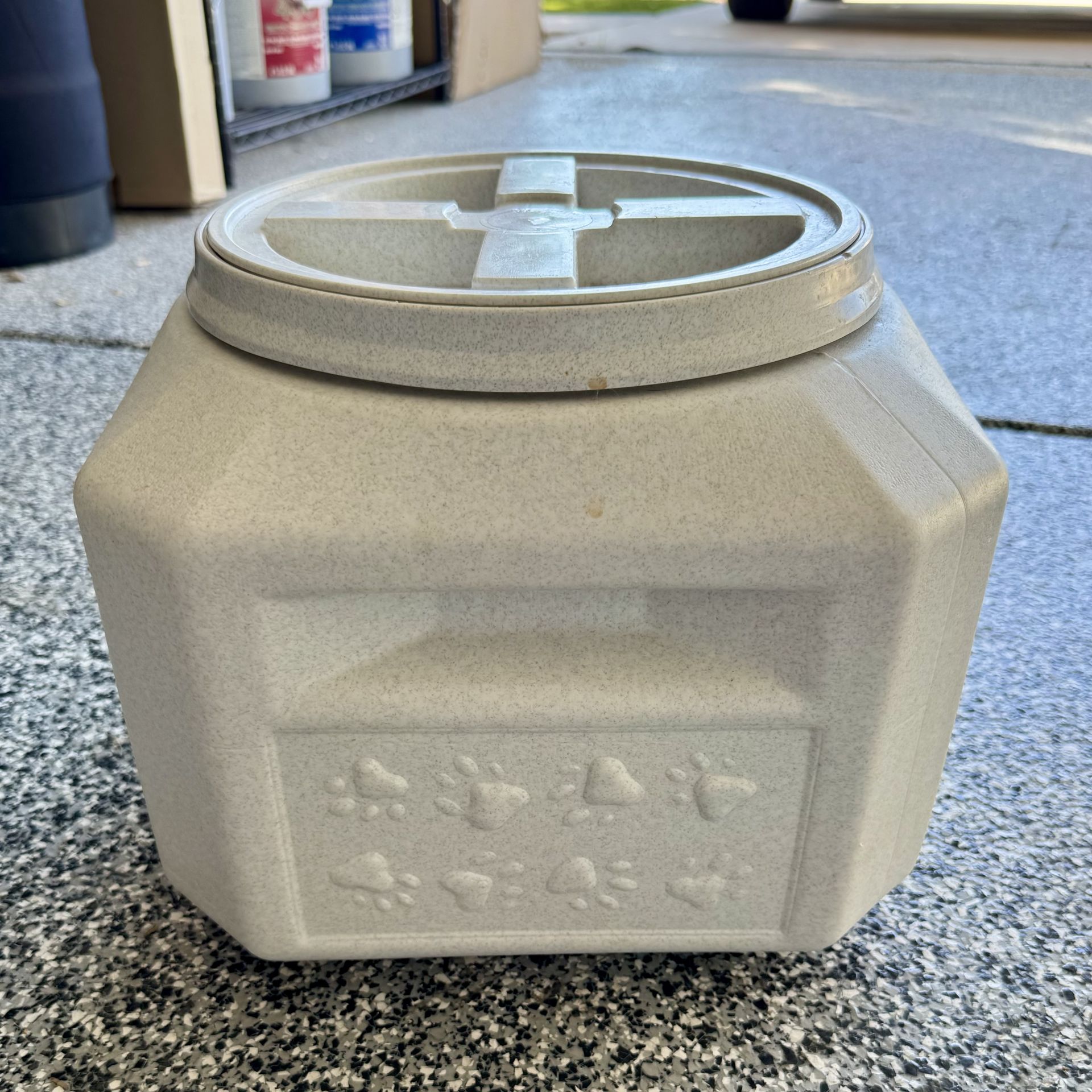 Vittles Vault airtight pet food storage container (15 lb size). • Holds up to 15 lbs of dry dog food • Airtight screw-top lid keeps food fresh • BPA free • Made in USA Includes scoop Used with normal cosmetic wear and light discoloration from regular use (see photos). Lid seals properly and functions as intended. Great for keeping kibble fresh and reducing odor.