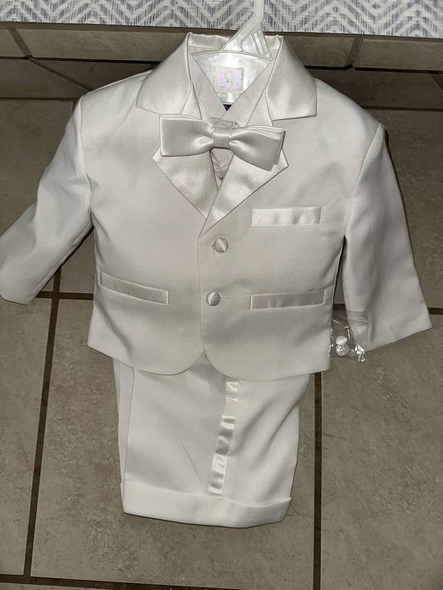 Small christening outfit all white. Has shirt pants vest cummerbund and jacket. Never worn too big for premie. Asking $50 obo