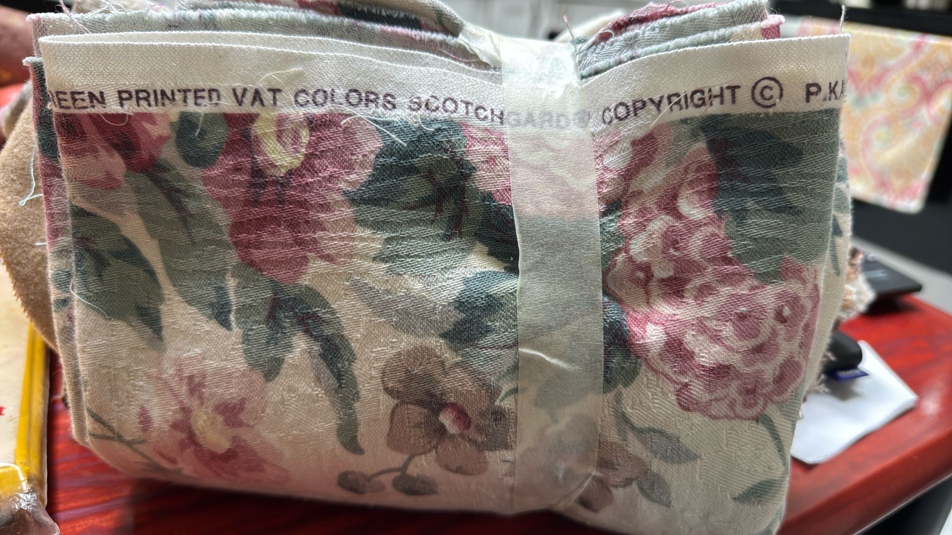 9 pieces of fabric mostly cotton, different colors and lengths. There is one that Kaufmann an artist that makes quilts and sweaters with his own designs. He printed fabrics also with his designs.