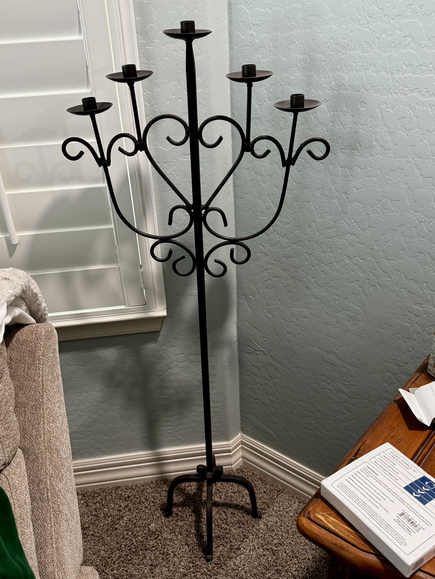 Five Candle candelabra, black, 52 inch tall , 20.5 at widest point. Truly heavy duty, it’s pretty solid.