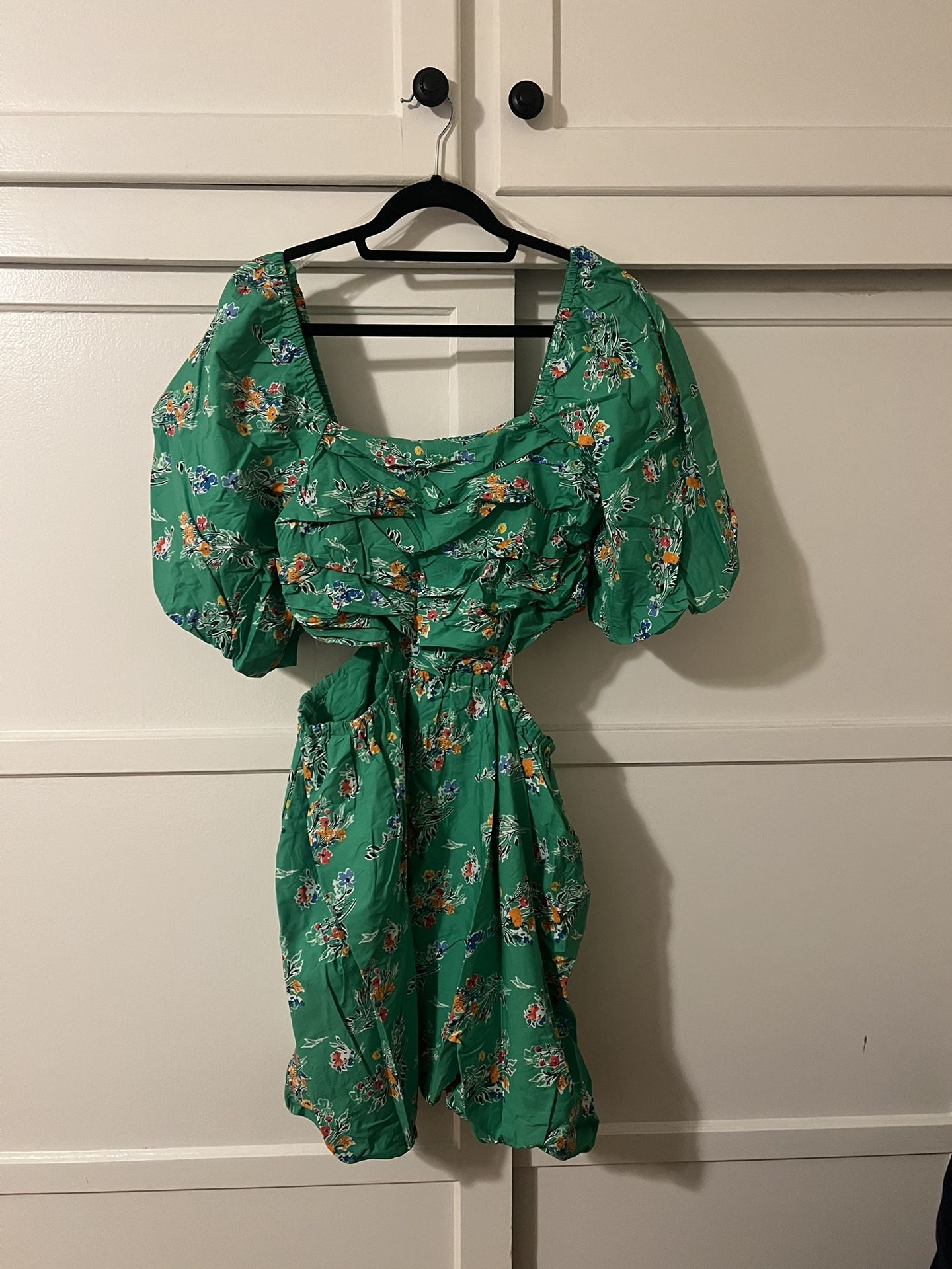 Green floral spring/ Easter dress Used - only worn once, like new Size Large Has pockets, bubble sleeves