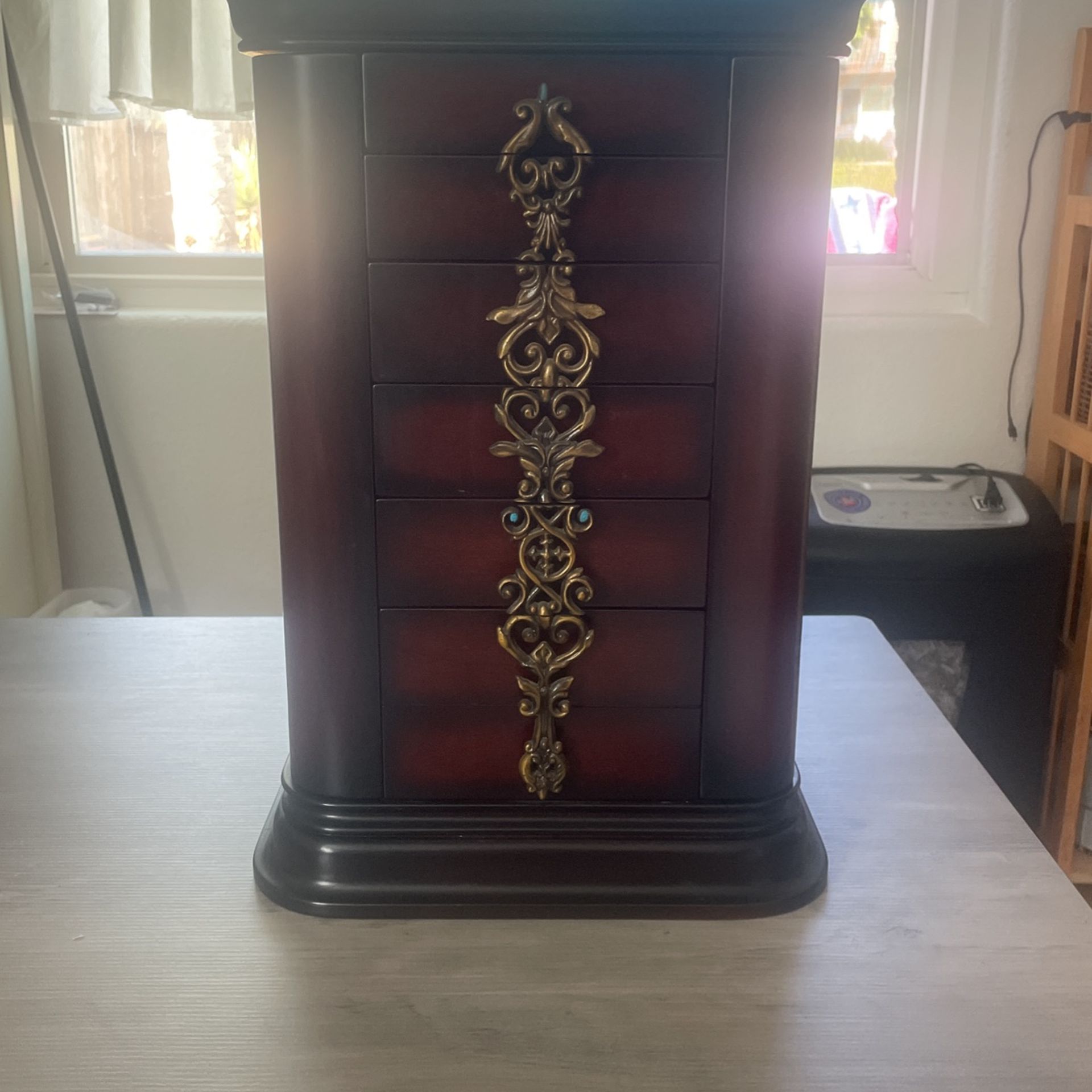 5 drawers including one ring drawer and open top area as well. Two side doors with 6 total hooks. May need a little wood shiner to sproose up!