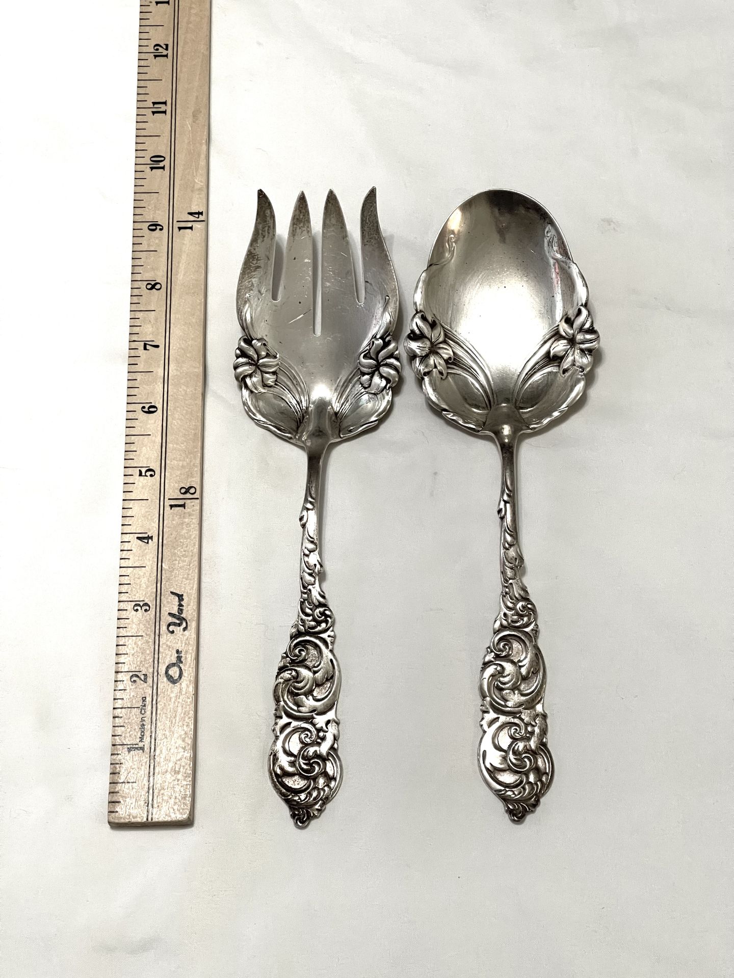 Antique over 100 years old great condition .925 silver serving flatware. Large fork and spoon. These weigh 200 grams which is around 7.6 ounces. These are solid silver very collectible.