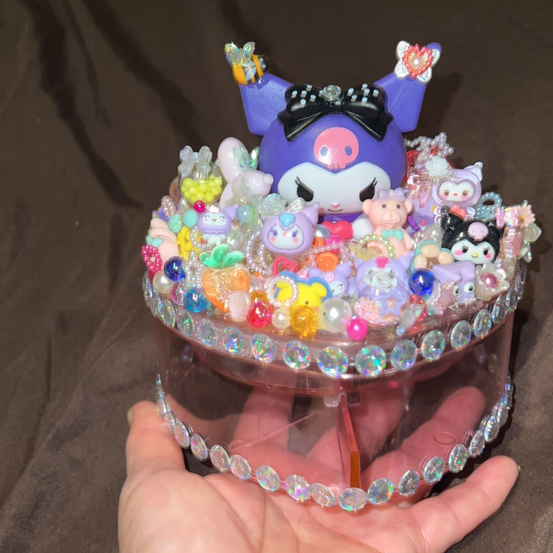 Everything created on this box, except for beads are from Sanrio company called Sanrio charms and collections. DIY I had to pay for the jewelry box separate which are limited additions and I create them. I only have two boxes, a pink one and a purple one. The pink one is Hello Kitty and the purple one is.Kuromi first come first serve a beautiful birthday gift Christmas gift. I will not take lesson $35 materials are very expensive and time-consuming I also include a small glue in case accidents happen at home you could just glue them back first come first serve. I will be posting the hello kitty tomorrow when I finish it thank you.