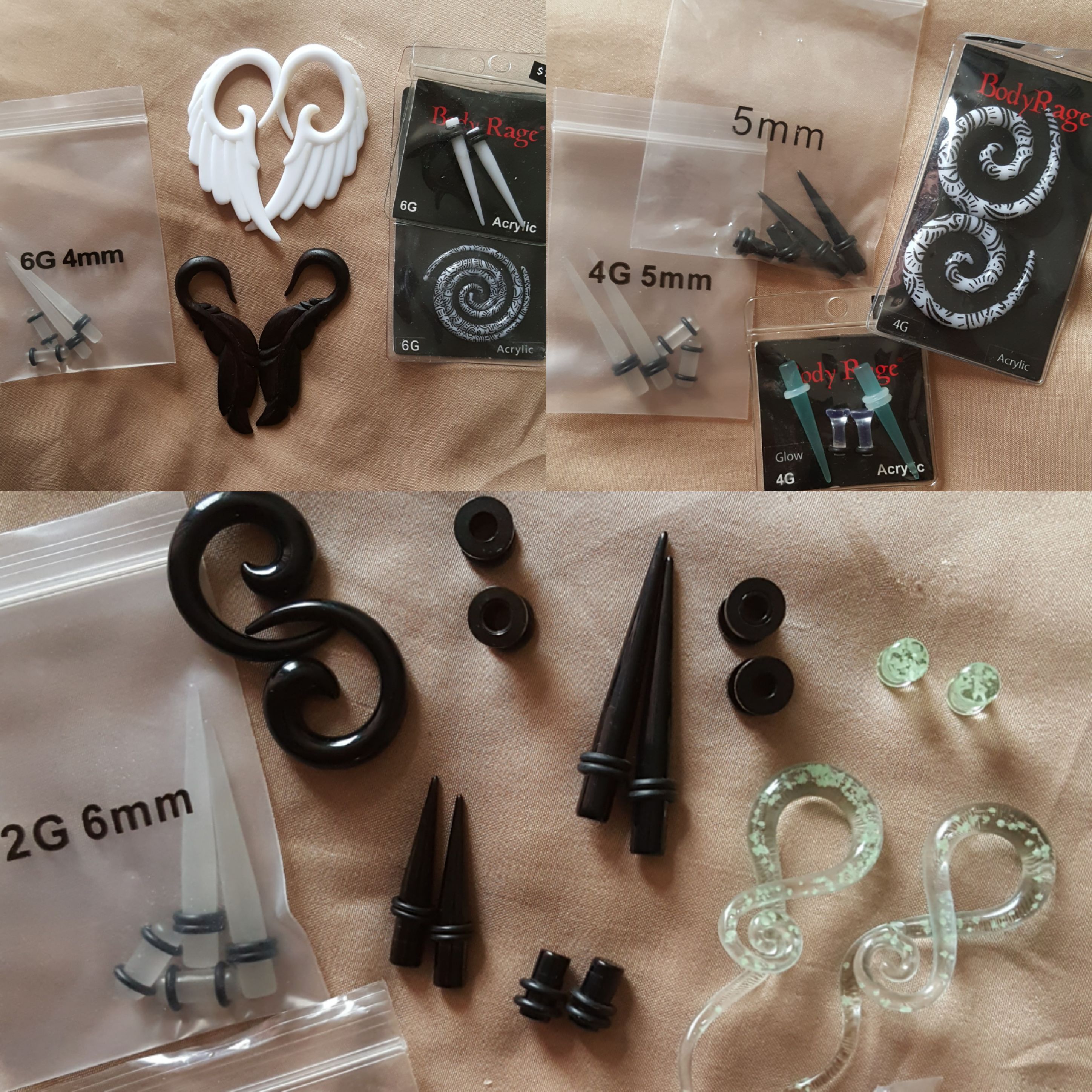 Some used and some new. All cleaned with 99% alcohol and hospital-grade barbicide. Plugs, Gauges, Hangers, Tapers, Tunnels, Spirals, Septums, Pinchers, Crescents 4mm -14mm (6g - 9/16" inches) Acrylic - $5 pair Acrylic (glow) - $5 pair Metal - $5 pair Glass (glow) - $5 pair Wood - $10 pair