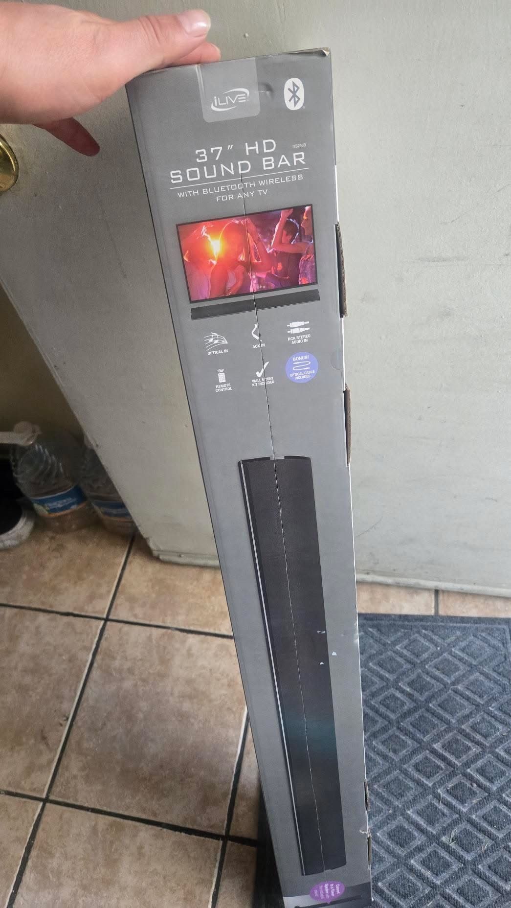 Compact Dimensions: Dimensions of 37 x 3.35 x 3.39 inches with a 37" length, making it a sleek addition to any room. Bluetooth Connectivity: Bluetooth wireless technology for easy pairing with Bluetooth-enabled devices, supporting A2DP profile. Enhanced Audio: Features 2 channel stereo sound with built-in stereo speakers and subwoofer output for rich audio experience. Versatile Inputs: Includes optical digital audio input, RCA stereo audio inputs, and Aux in (3.5mm audio input) for various connectivity options. Remote Control: Comes with a learning remote control capability and requires 2 AAA batteries (included). Mounting Options: Wall mountable with included hardware or can be converted to a tower speaker with the removable stand. Power Supply: Requires an AC/DC power adapter (included) for operation. Indicator Lights: Equipped with LED pairing indicator, source indicators, and power indicators for easy operation. Brand new in box never opened. Costs 58$ at walmart and online