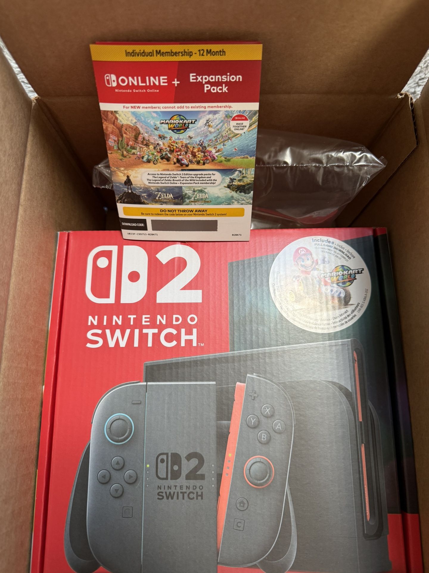 New in sealed box: Nintendo Switch 2 bundle with Mario Kart and 12 Month NSO + Expansion Pack Individual Membership. Switch 2: $450 Mario Kart: $80 NSO + Expansion Pack 12 mo Membership: $50 + tax + the value of having it to play today Have in hand. Cash only.