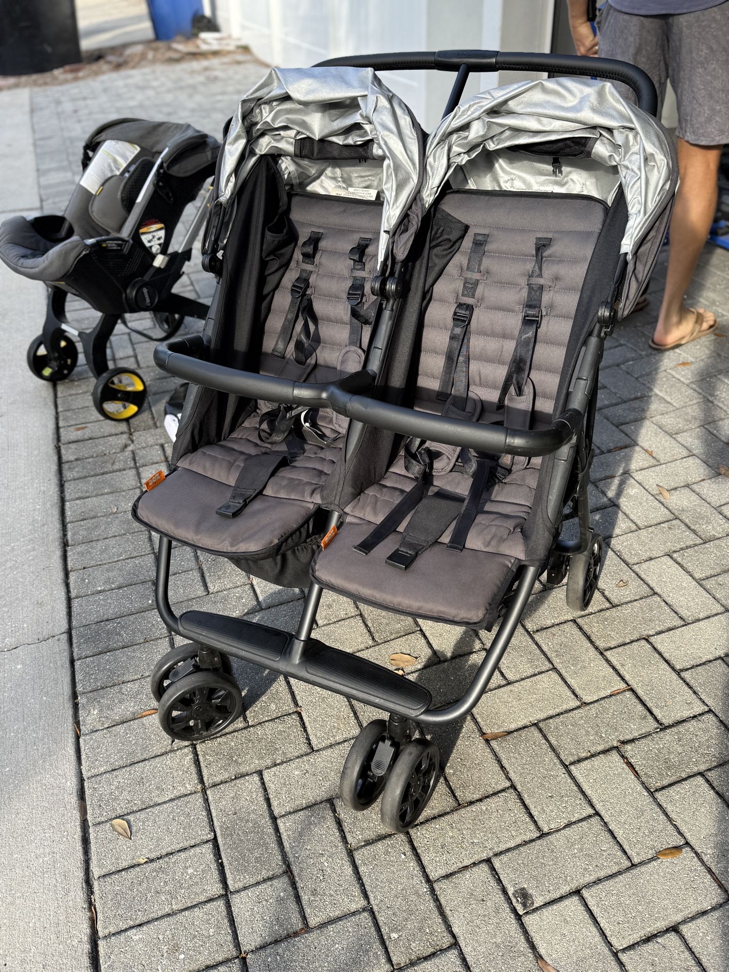 Zoe Baby Double Stroller The Twin double stroller is designed to help parents navigate life with two (or more) kiddos and experience the world as a family. It goes beyond fitting through doorways and effortlessly converts to a trio or quad stroller with the help of patented add-on seats, a wide range of car seat compatibility, and one of the highest seat weight capacities on the market. Its super lightweight frame and reliable, compact fold make tackling errands with kids in tow a breeze, while the deep recline, two full-size seats, and 4-panel canopy create a sun-protected dreamland.