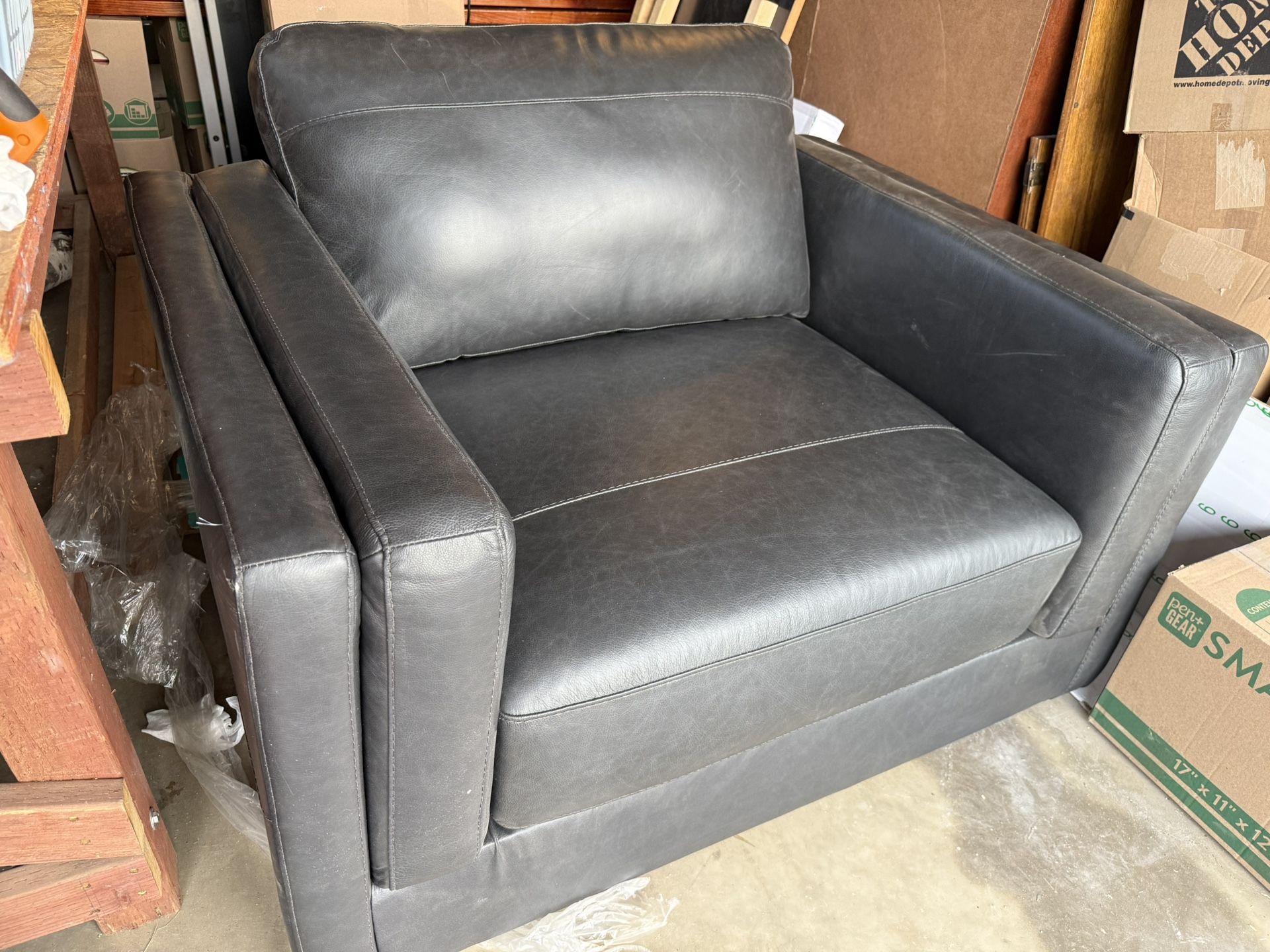 Oversized chair, black leather-like material 48” wide x 40” deep x 36” tall “Chair and a Half”