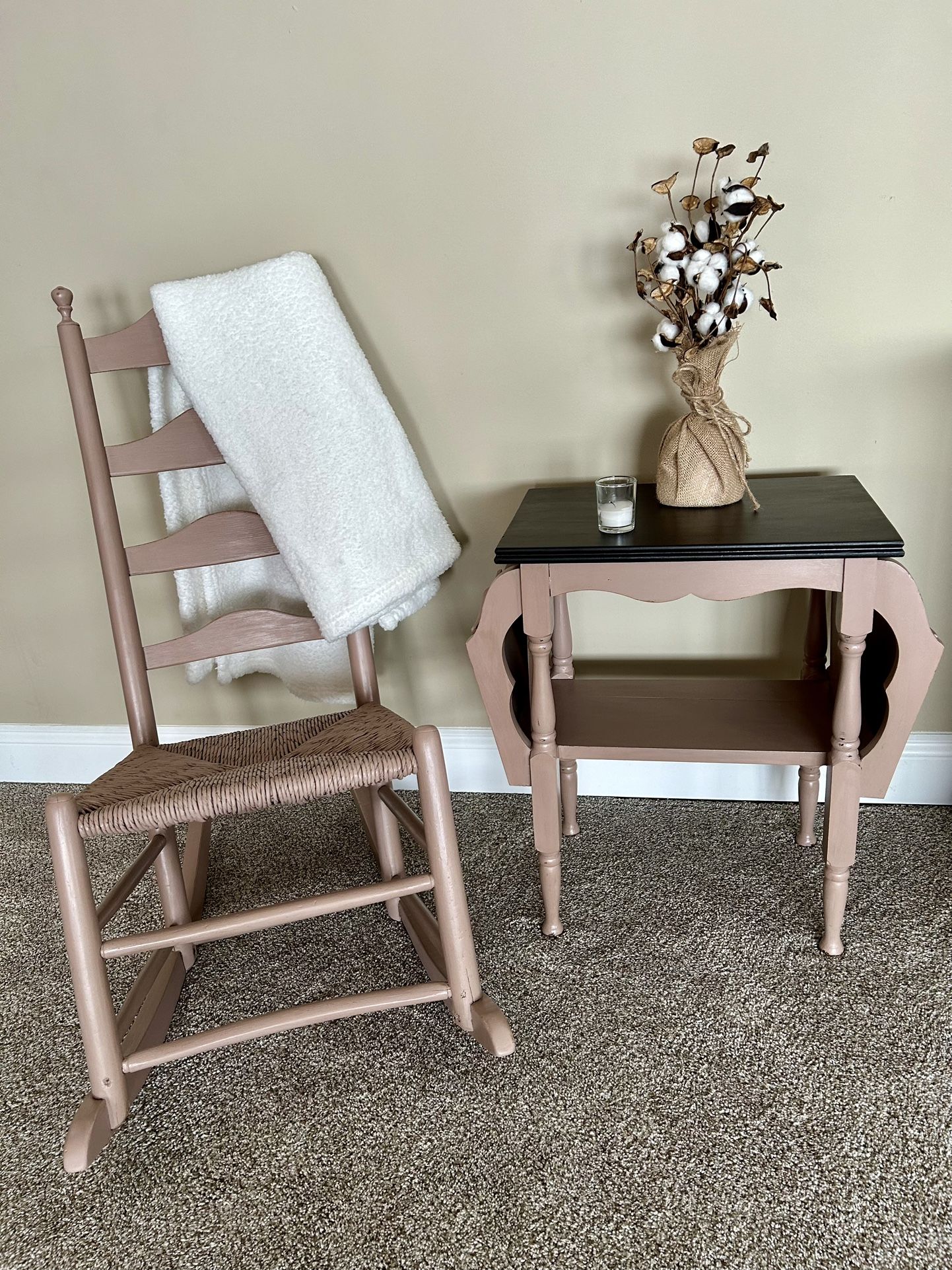 Cute magazine table and ladder back chair done in pink, sealed in poly . Could be used inside or outside.