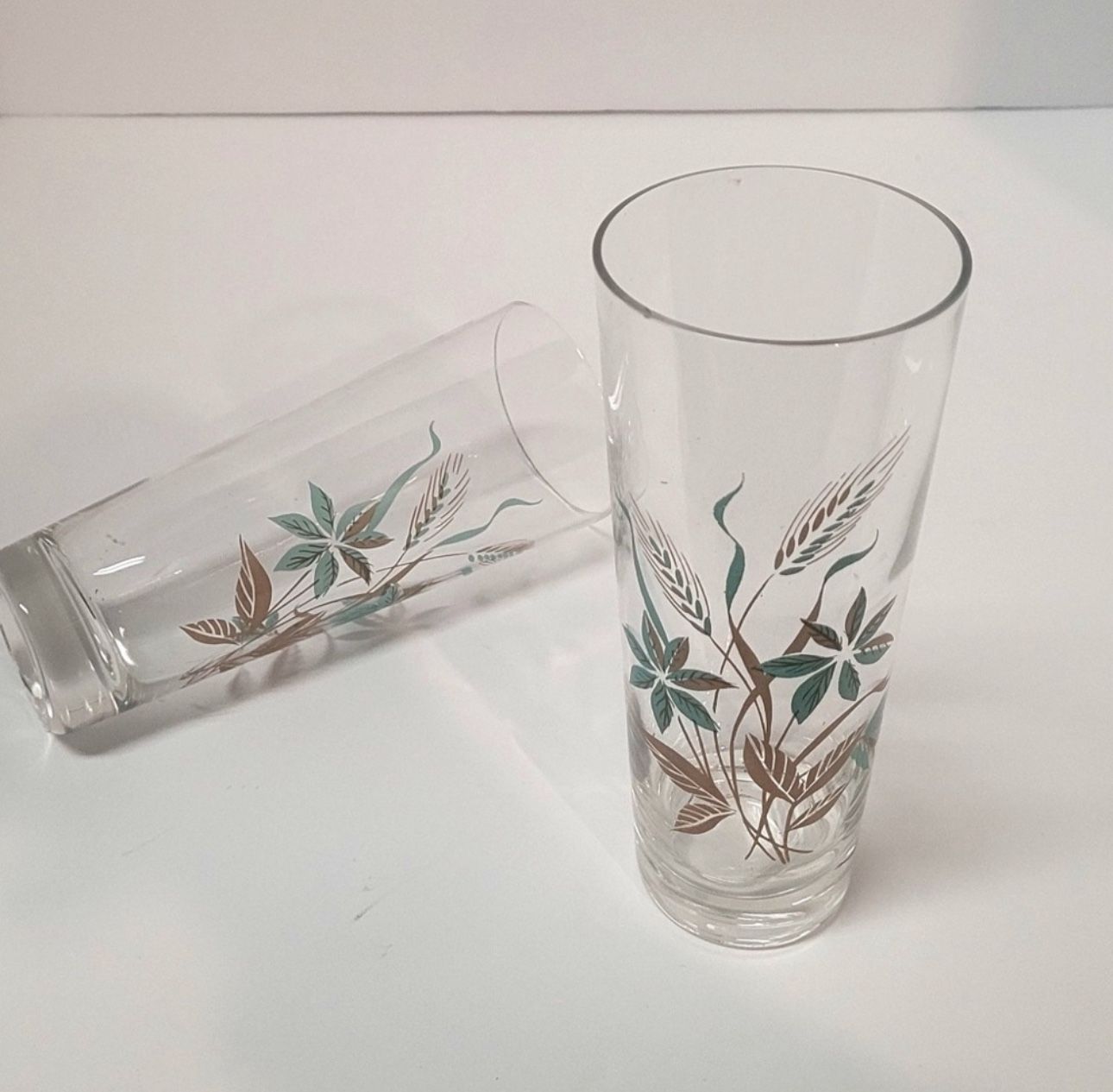 This is a very hard to find pattern called Canadian Wheat produced by Georgian China, a Canadian Company, from 1(contact info removed)'s. They were made to compliment the Mid-Century dish ware of the same pattern. These are two highballs or tumblers with a floral pattern of aqua/turquoise flowers with brown wheat on clear glass. The condition is very good with no scratches or loss of color. They measure approx. 5 1/2" tall X 2 3/4" diameter at the top. These are a great mid-century addition to your home bar or vintage glass collection. Thanks for looking!