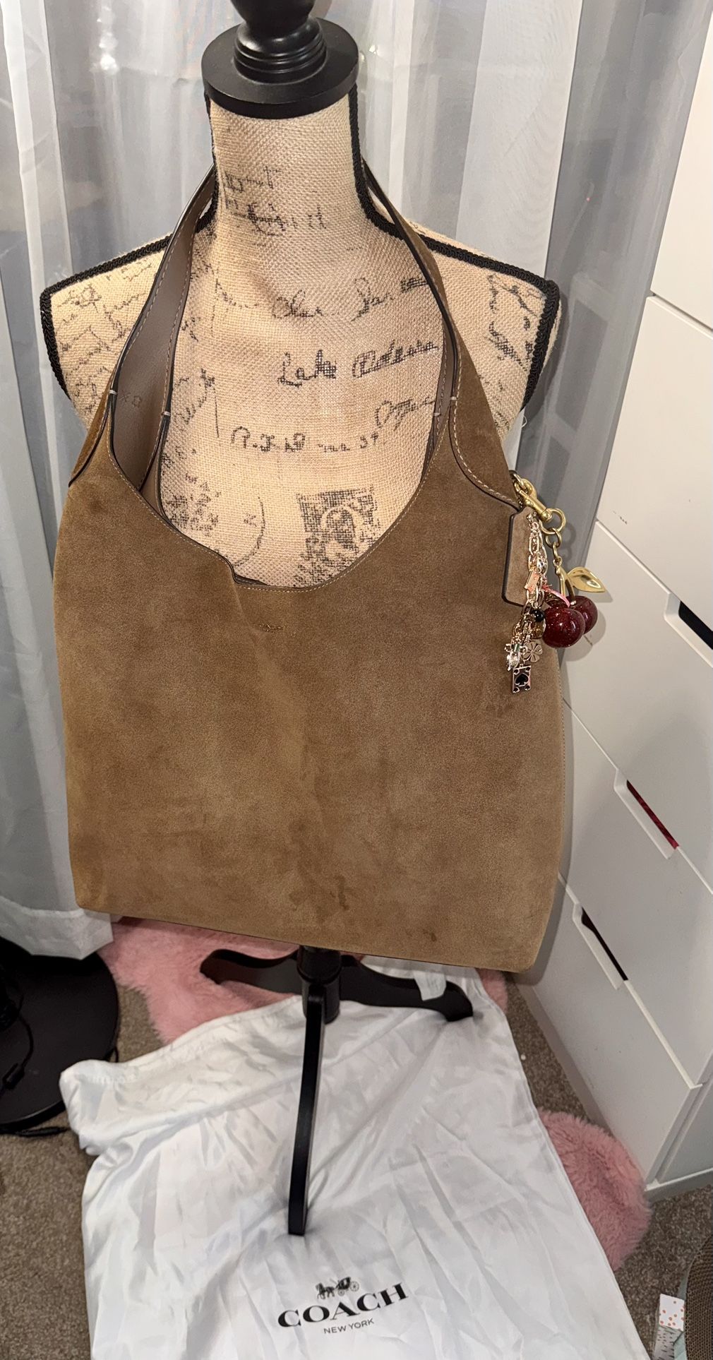 You too can be a super model and strut your stuff w/ the very exact bag shown on Bella Hadid! Suede in excellent condition. Two small water spots pointed out in picture, not really noticeable. Comes w/original dustbag. Charms are not included. Bag is really a stunner! Purchased in 2024 from Macy's. PRODUCT DETAILS This Coach Brooklyn shoulder bag is crafted in calf suede with a leather lining. The design features a concealed magnetic fastening, a single shoulder strap, a main compartment, and an internal patch pocket. A logo stamp to the front, logo plaque, and logo pendant add a signature touch. The interior also features a de-bossed internal logo. Strap Type Single Shoulder Strap Material Calf Suede Debossed Internal Logo Closure Concealed Magnetic Fastening Color brown Coach Gold Tone Shoulder Bags More great fashion deals on my page—bundle to save!!!