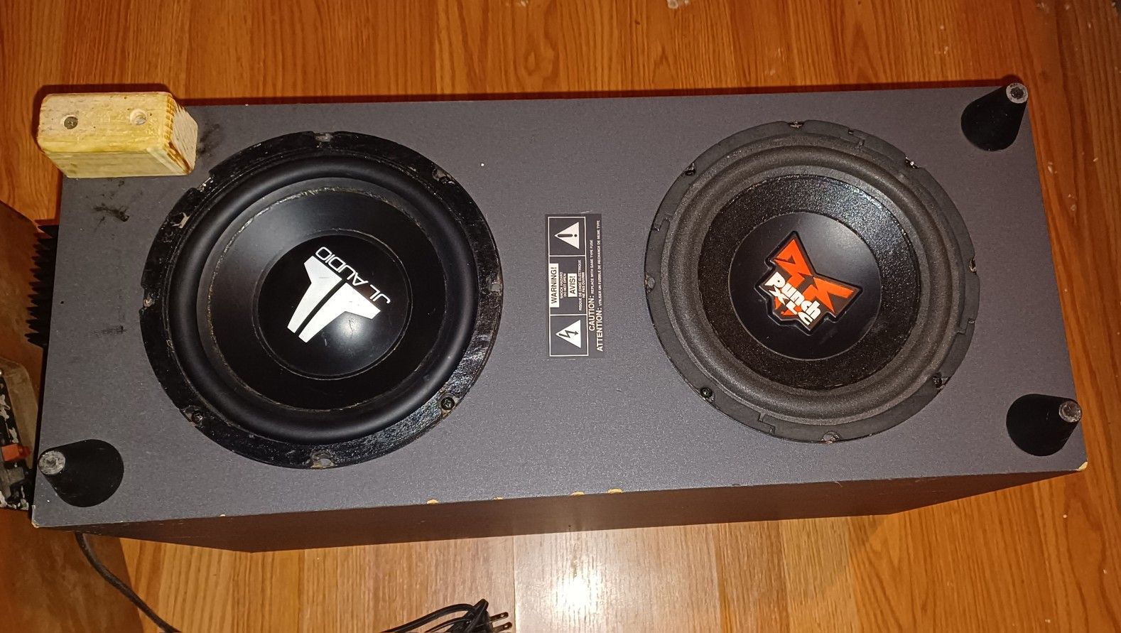 I put in a rockford fosgate 8" xlc and a jl audio 8w6 as replacements. These both have new surrounds installed but unfortunately there is one small tear on the fosgate during the move to my new house. It's surprising how low these 2 8s will go. The enclose being narrow allows them to fit in places like behind your couch. One ruber foot was missing so it's got a wood peg leg now lol. I used to use multiple powered subs but its too much for my new place so these have been just collecting dust. I will include the original 8" jbl drivers but they need surrounds installed. Dimensions are 26"x10"x18" this set up weights 50+lbs. The jl woofer alone sells for $100+ used on fleaBay and no I will not seperate