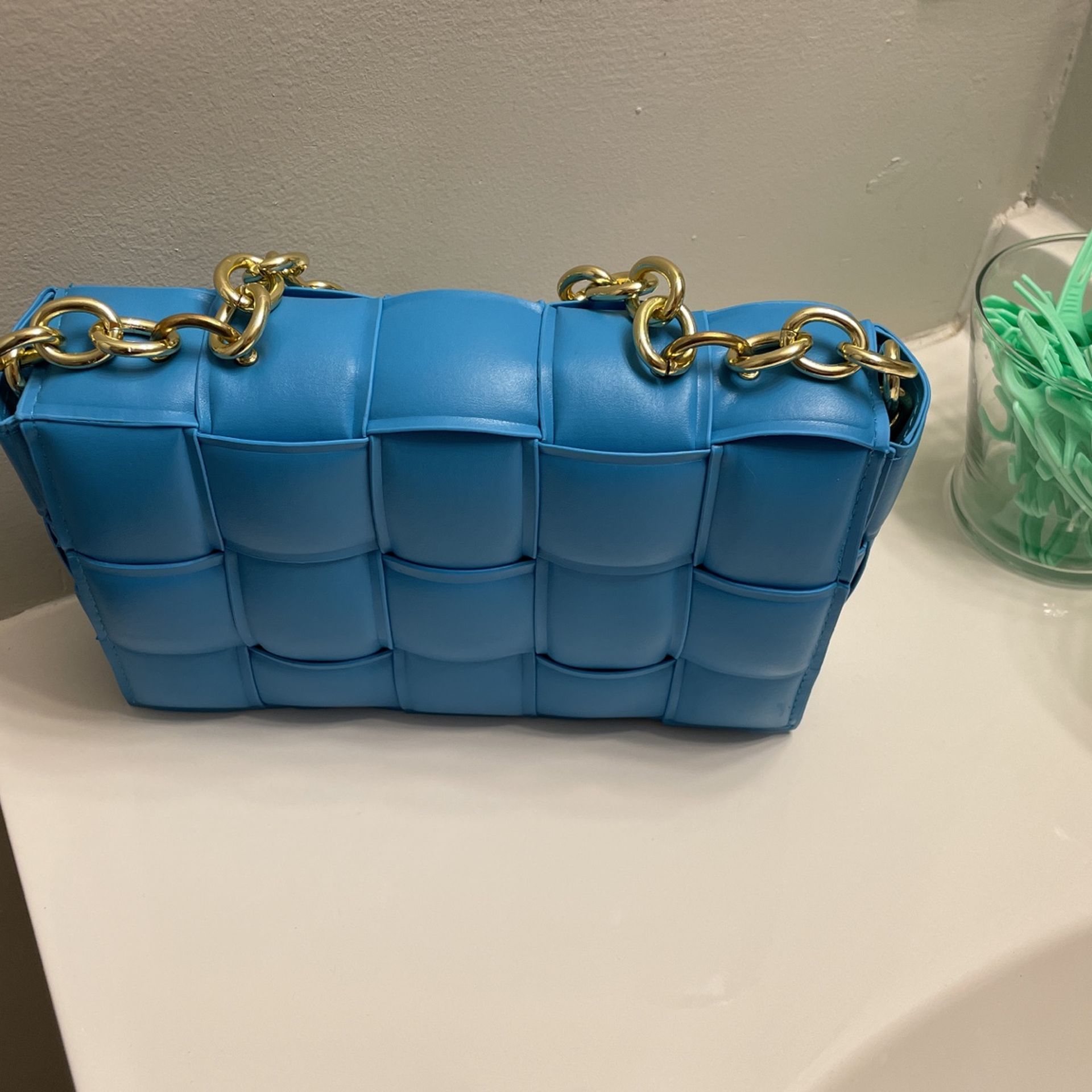Brand New Blue Purse With Gold Chain.