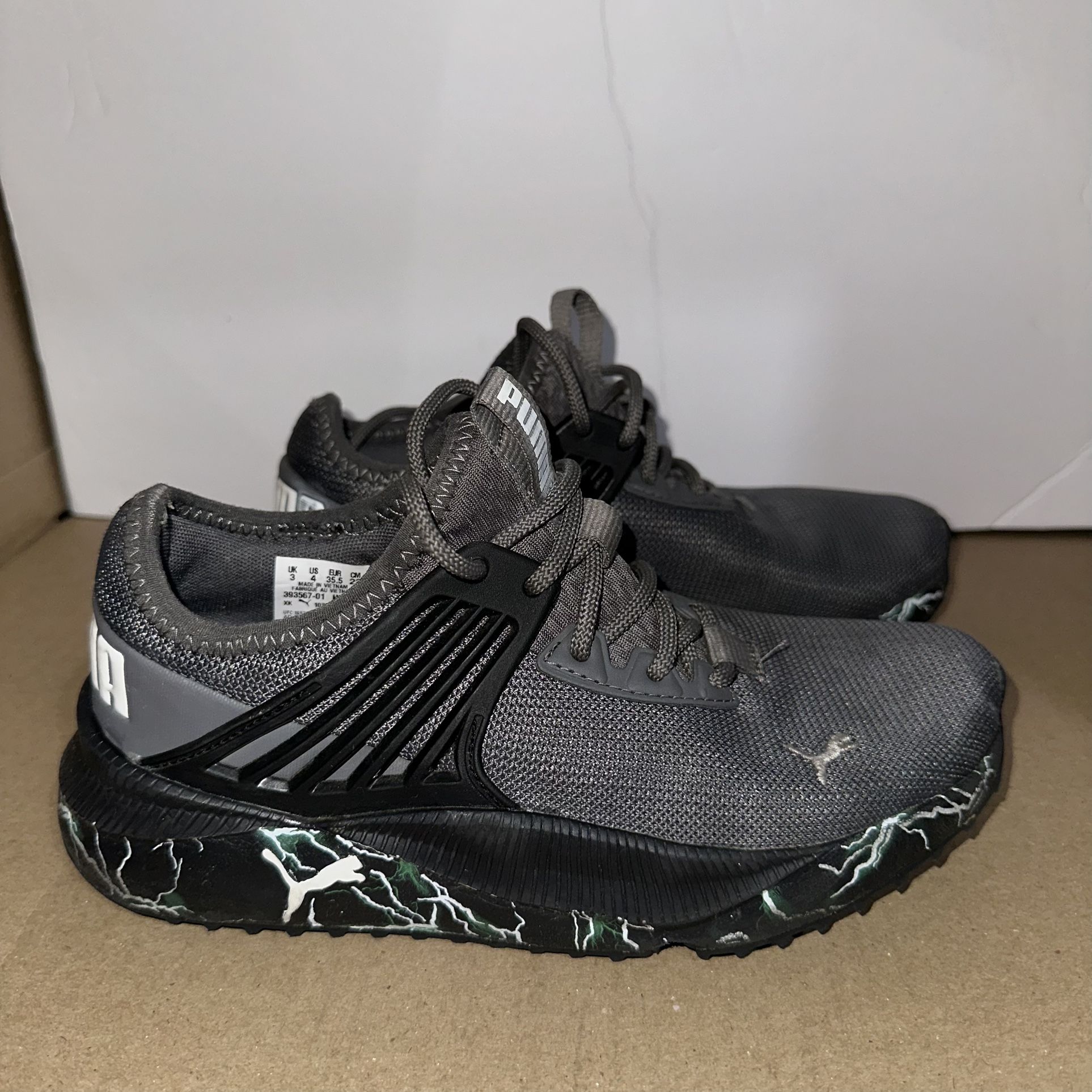 Size 4- very good condition-see photos. Whether on the playground or in the classroom, the Pacer Future Heat Lightning sneaker from Puma has them covered. This lace-up sneaker flaunts a breathable fabric upper with TPU cage to provide lateral and medial support and a unique midsole with lightning graphics for augmented appeal. The rubber outsole makes sure that the movements feel effortless and stable. Fabric & TPU upper Lace-up closure Round toe Fabric lining Fabric footbed Rubber sole