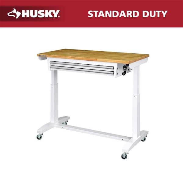 Husky 46 in. W x 24 in. D 2-Drawer Adjustable Height White Worktable with Solid Wood Top New In the box Cash only Pick up only