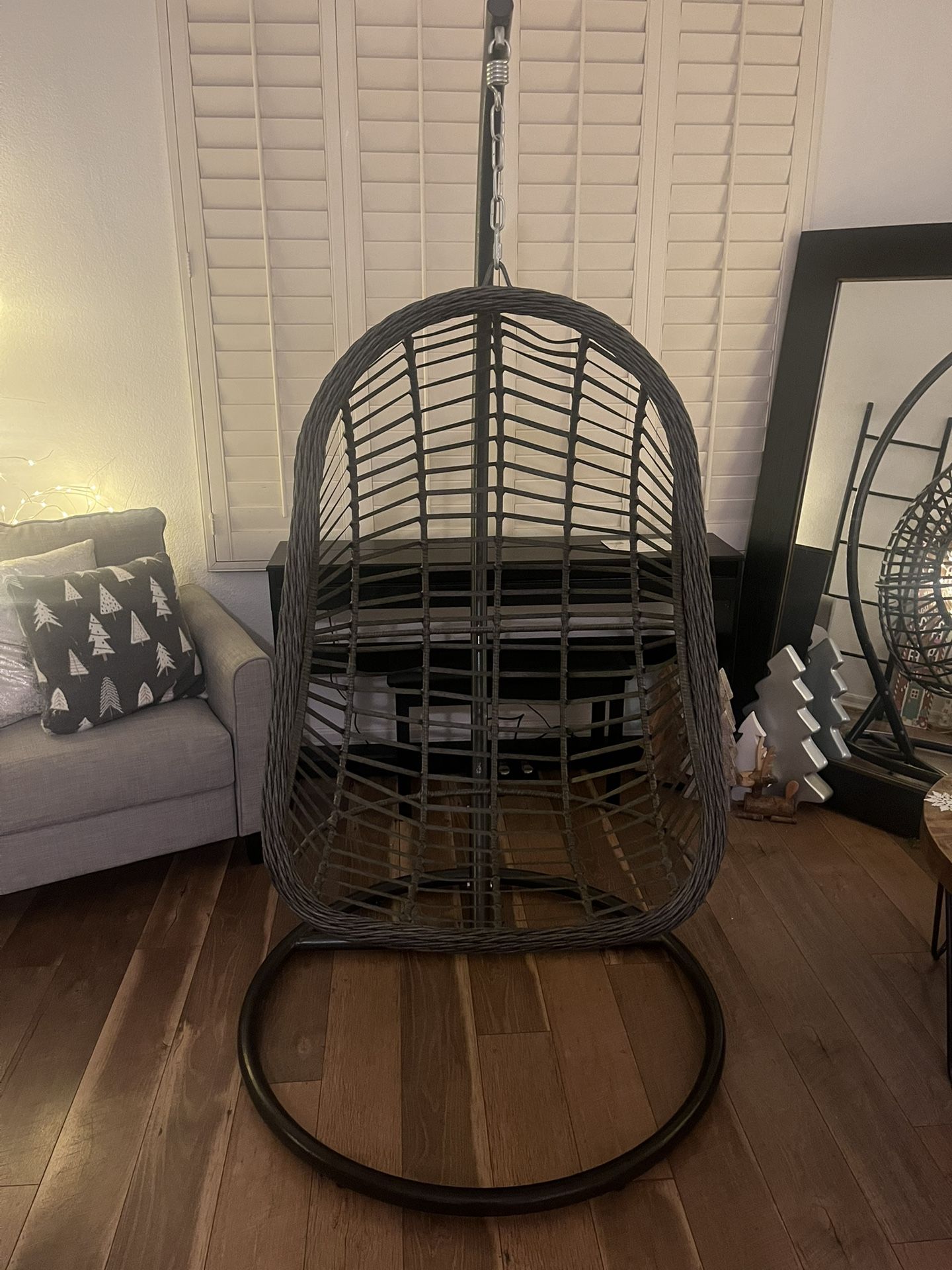 Hanging Egg Chair Swing. Includes Heavy Duty Steel Stand for support. Designed for both indoor and outdoor use. Comes with plush removable cushion for comfort. Has a weight capacity of 300 lbs