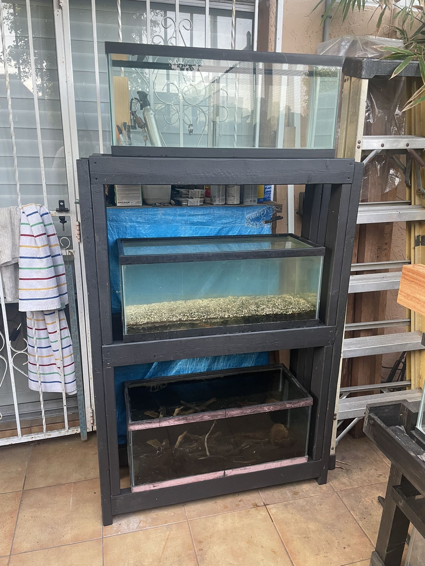 For sale are (3) 20 gallon long aquarium with the is an aquarium rack as pictured. The dimensions are 39” wide x 12-1/2” deep and 69” to the top of the aquarium on top.