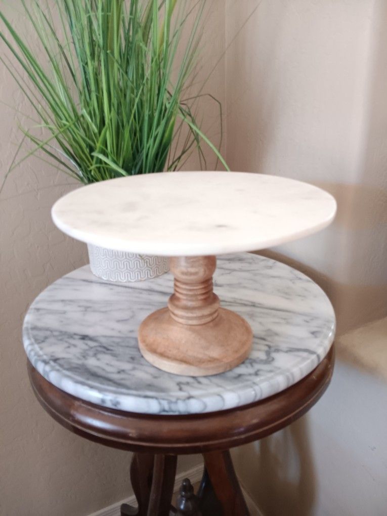 $19 Mango Wood White Marble Cake Stand. Wood has a small crack, lots of Character.